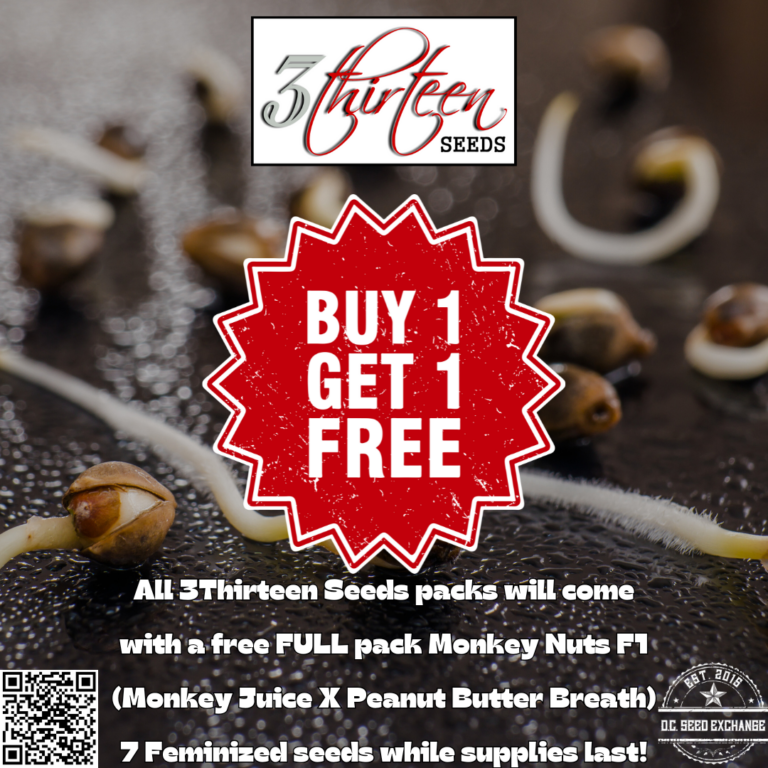 All 3Thirteen Seeds packs will come with a free FULL pack Monkey Nuts F1 (Monkey Juice X Peanut Butter Breath) 7 Feminized seeds while supplies last!