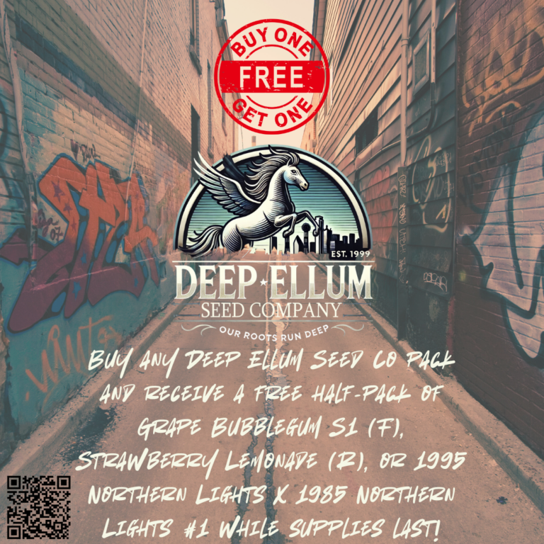 Buy any Deep Ellum Seed Co pack and receive a free half-pack of Grape Bubblegum S1 (F), Strawberry Lemonade (R), or 1995 Northern Lights x 1985 Northern Lights #1 while supplies last!