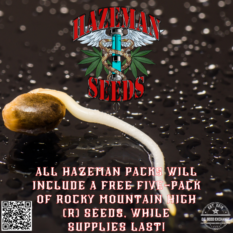 All Hazeman packs will include a free five-pack of Rocky Mountain HIgh (R) seeds, while supplies last!