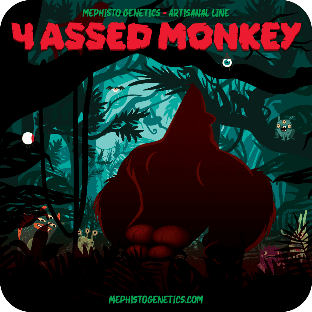 ‘4 Assed Monkey’ – those familiar with Mephisto know we don’t just use a name to sell seeds, to jump on the hype train, or to piggy back off of someone else’s hard work. It’s not our style. In fact, to create a new auto strain that really bares a significant resemblance to the photoperiod strain you start with takes a lot of dedication, even more so than the usual high levels of work and time that we put in. In our opinion and experience it can take 3 outcrosses to your desired photoperiod to really lock traits down and to feel comfortable to put that little word, ‘auto’ before or after a famous strain name. To do that work could easily take 5-6 years. This single cross of Gorilla Glue #4 to our Grape Crinkle, working it over 4 generations to become fully auto and testing time, has taken over 2 years alone. Initially we made a cross of GG#4 x Ripleys OG and also the GG#4 to Grape Crinkle for evaluation, but after the F1 grow out, we settled on the GG#4 and Grape Crinkle cross being the one to develop. We’re happy to say that we’re stoked with the outcome, and by calling it 4 Assed Monkey, that pays homage to it being related to Gorilla Glue #4, and also to our company namesake, Dr. Mephisto, who made his 5 assed monkeys in his lab. We’re on our crazy farm developing 4 assed monkeys, so to us, 4 Assed Monkey seems quite poetic. This girl is a quick one, sparkly with frost, high in terps and has become something unique which we’re super proud of.