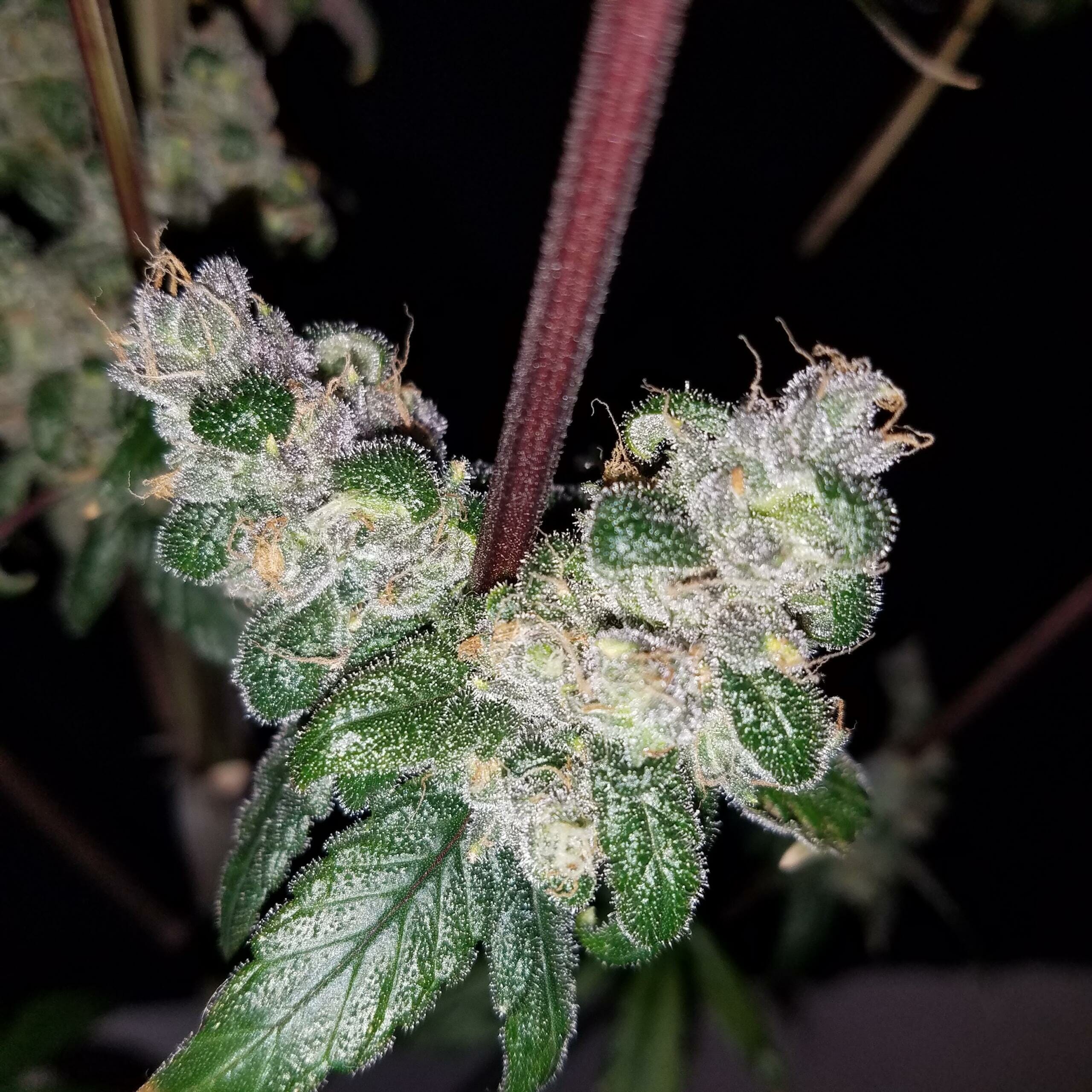 Featuring a pole-structured foxtail purple-hued spear tip cola pheno. And tall lateral branches with tightly clustered nugs. Flavors from creamy blueberry muffins to dank plum wine berries. Accompanied by subtle floral and grape notes.