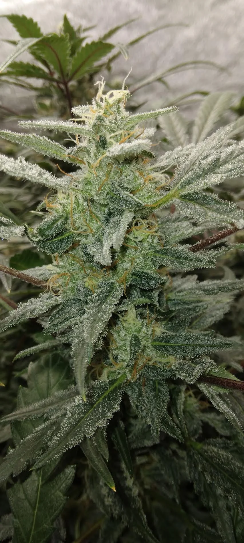 The Cookie Smasher mom was an absolute frost monster, carpeted in trichomes from fan leaf to stem, with a complex strawberry cookie aroma. A fantastic hashplant that would drop trichomes off of her dried flowers when handled.