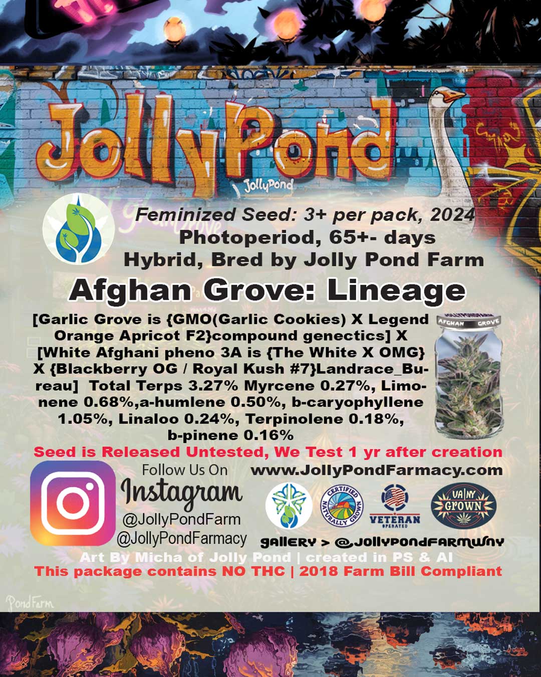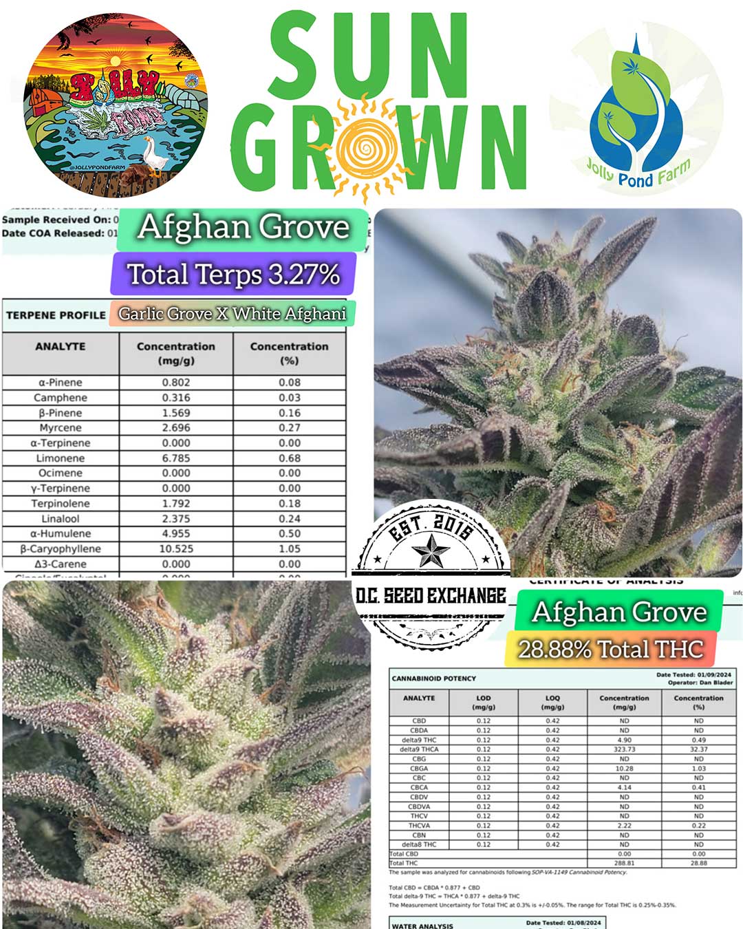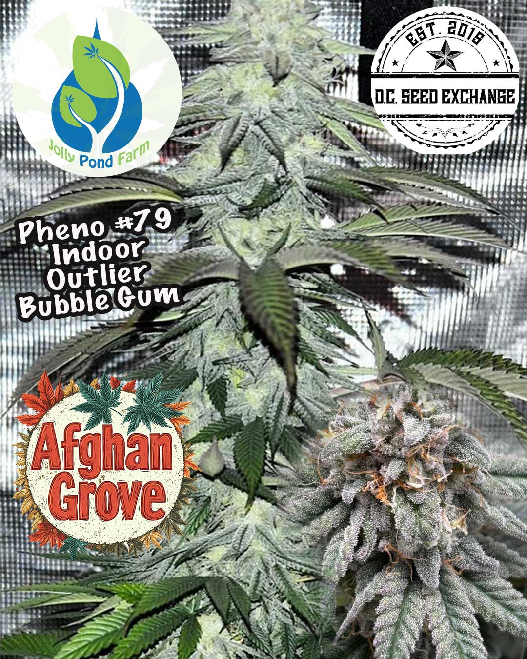 Garlic Grove went on a similar journey of growth to be truly tested and she straight crushed them all; inside, outside, deps, high humidity, just beast mode in all situations. Garlic grove was in the first fem seed run with WA 3A, we never released that seed yet we handed it off to a friend who hunted them all. That is what became Afghan Grove (Garlic Grove X White Afghani 3A). We made 3 selections from that stock, 47, 77, 79, we lost the February fire entry #47 which scored 7.2 from the judges and the posted labs are from that pheno.