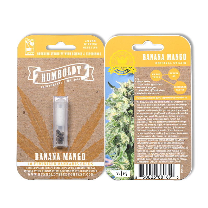 We threw around the name Humboldt Smooth before deciding that banana and mango are the dominant aromas. The combo of terpene profiles that make these unique seeds is rare in our experience. This strain packs a punch and might leave you on a tropical beach soaking up the sun. You will appreciate the huge plants and amazing vigor. PM resistant but can have mold towards the end of the season. High trichome production, but the nose is what makes this so special.