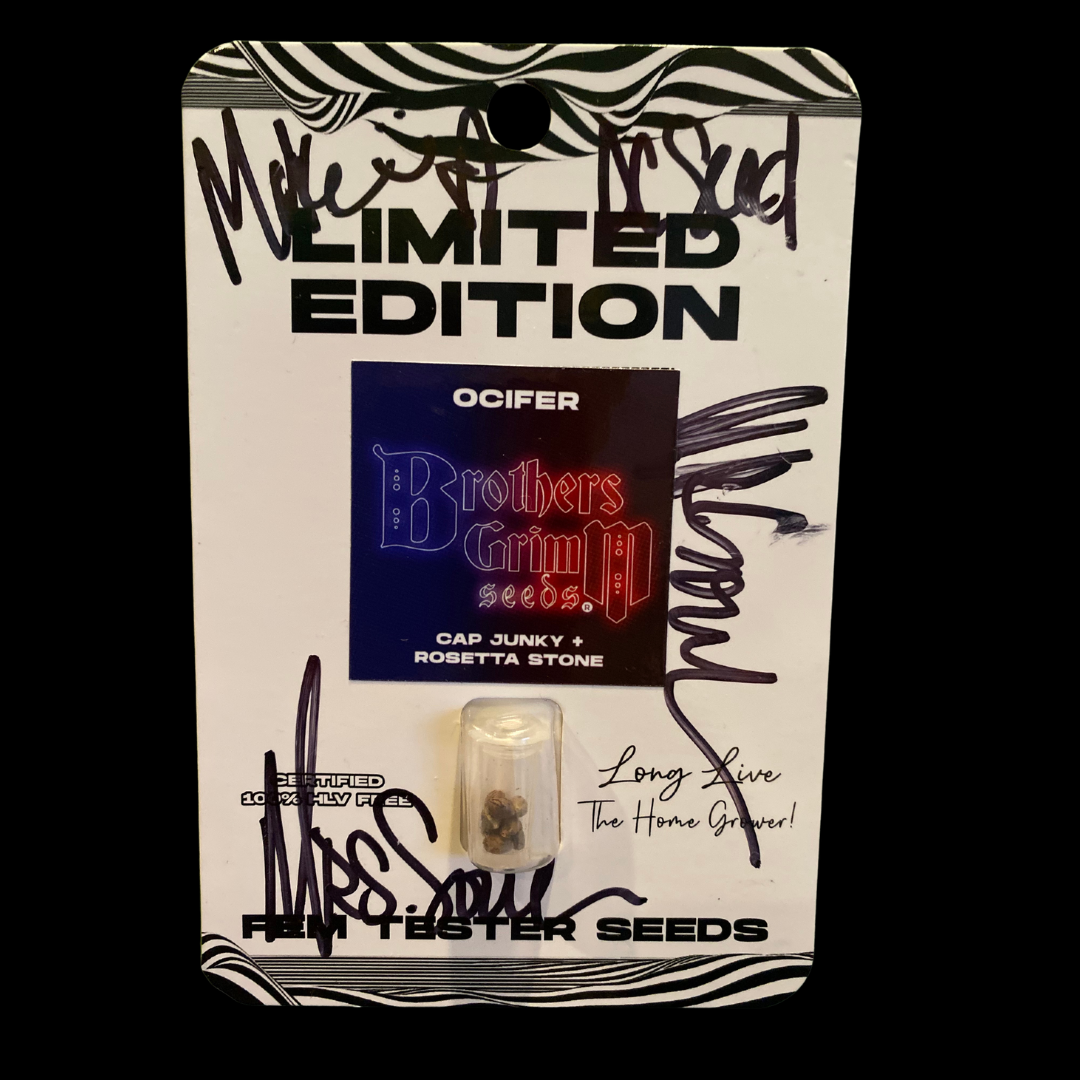 You are bidding on one special MrSoul autographed limited edition Brothers Grimm Seeds Ocifer F1 (Cap Junky x Rosetta Stone) 6 Feminized Photoperiod Seeds pack!