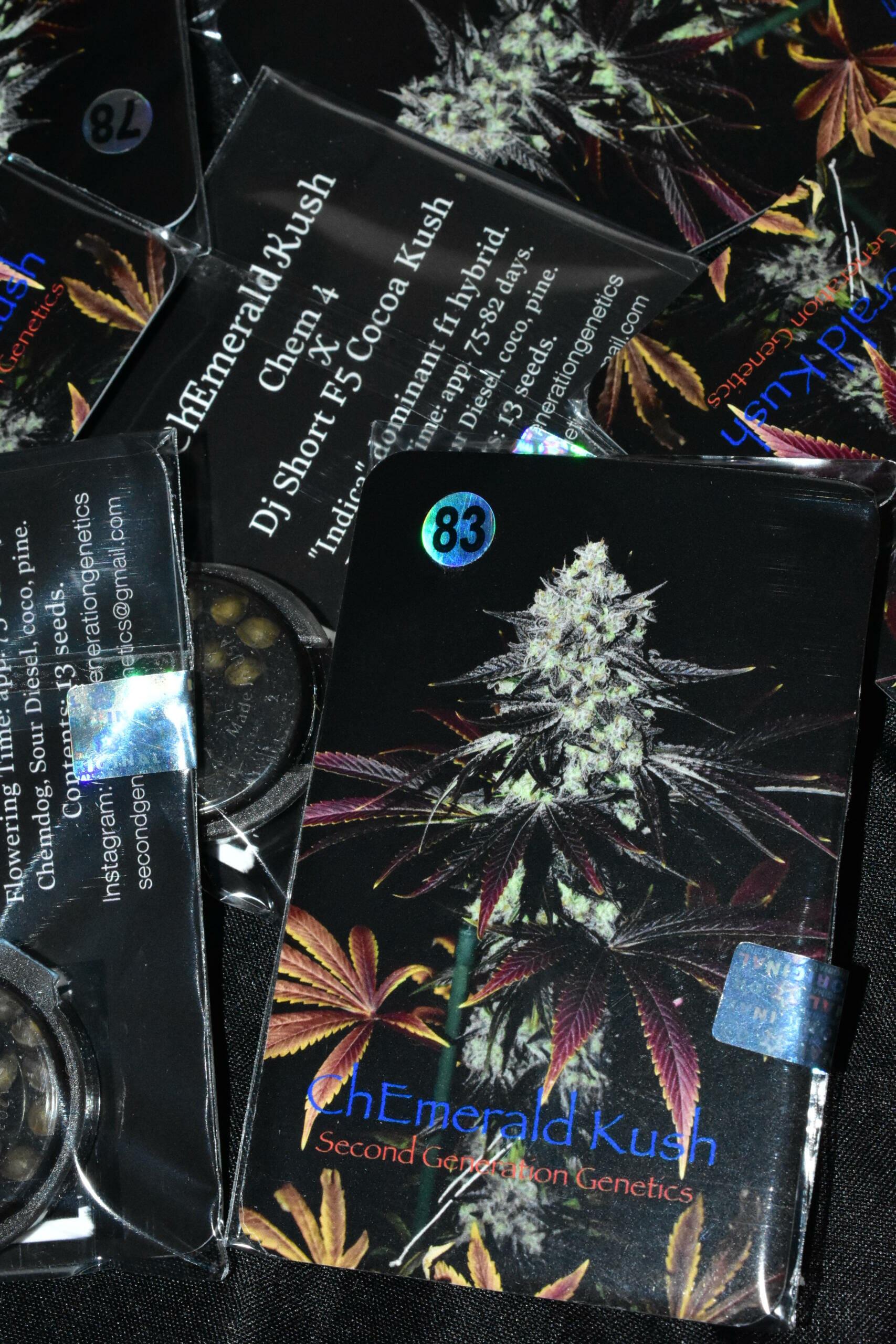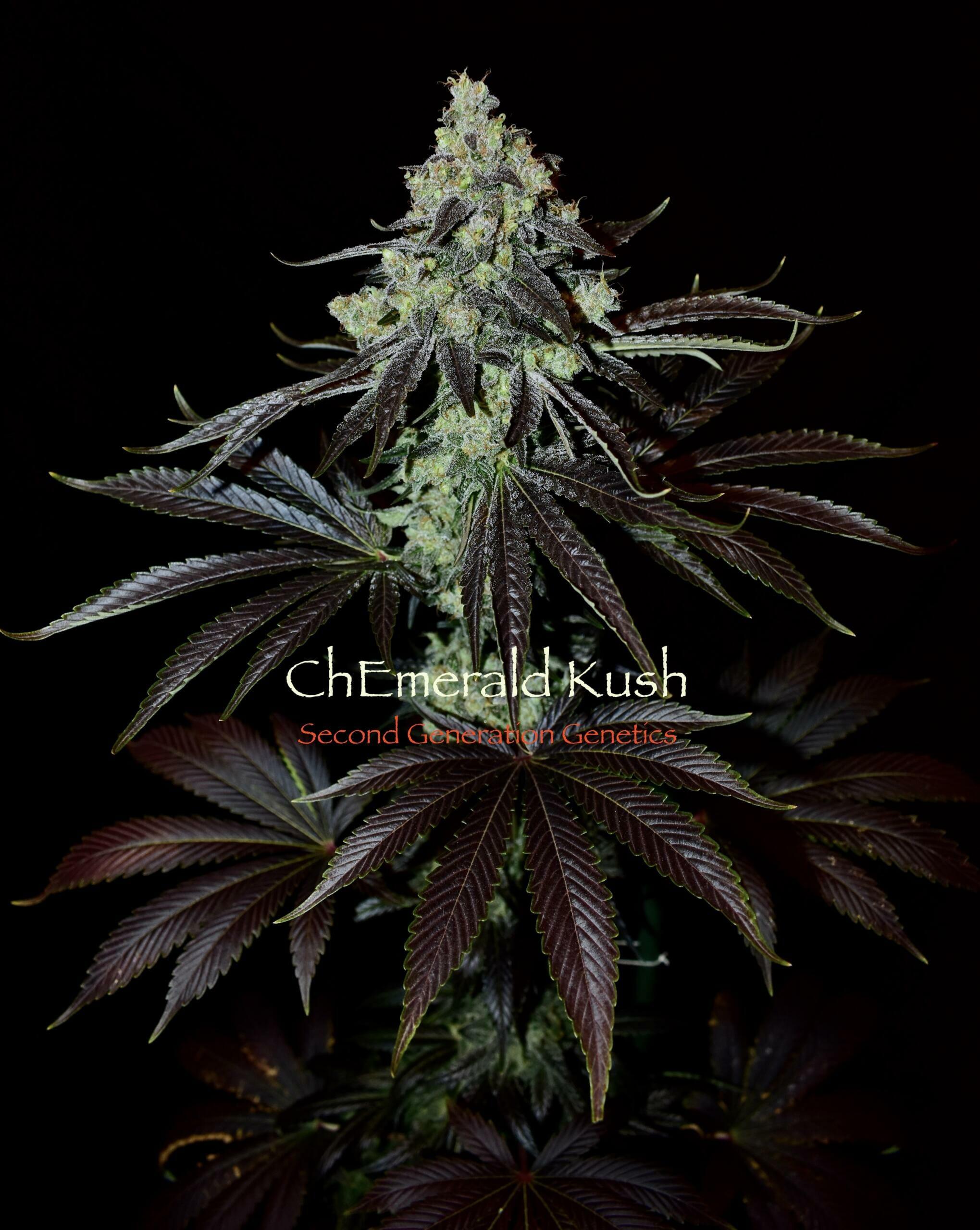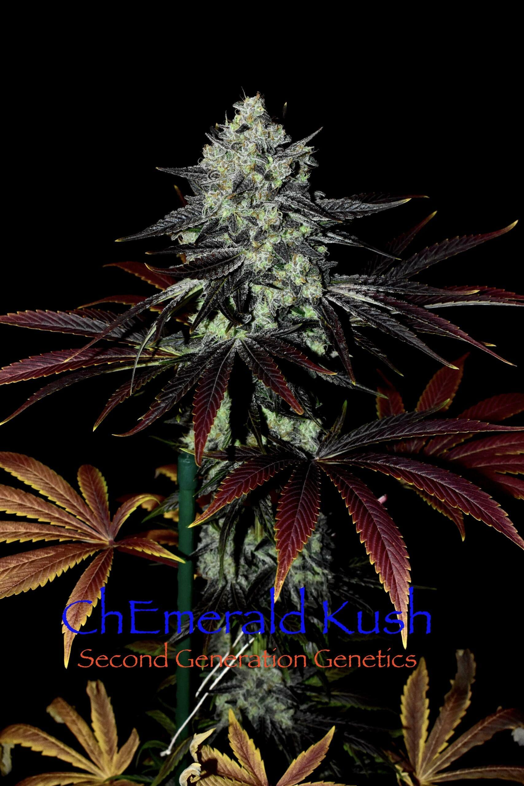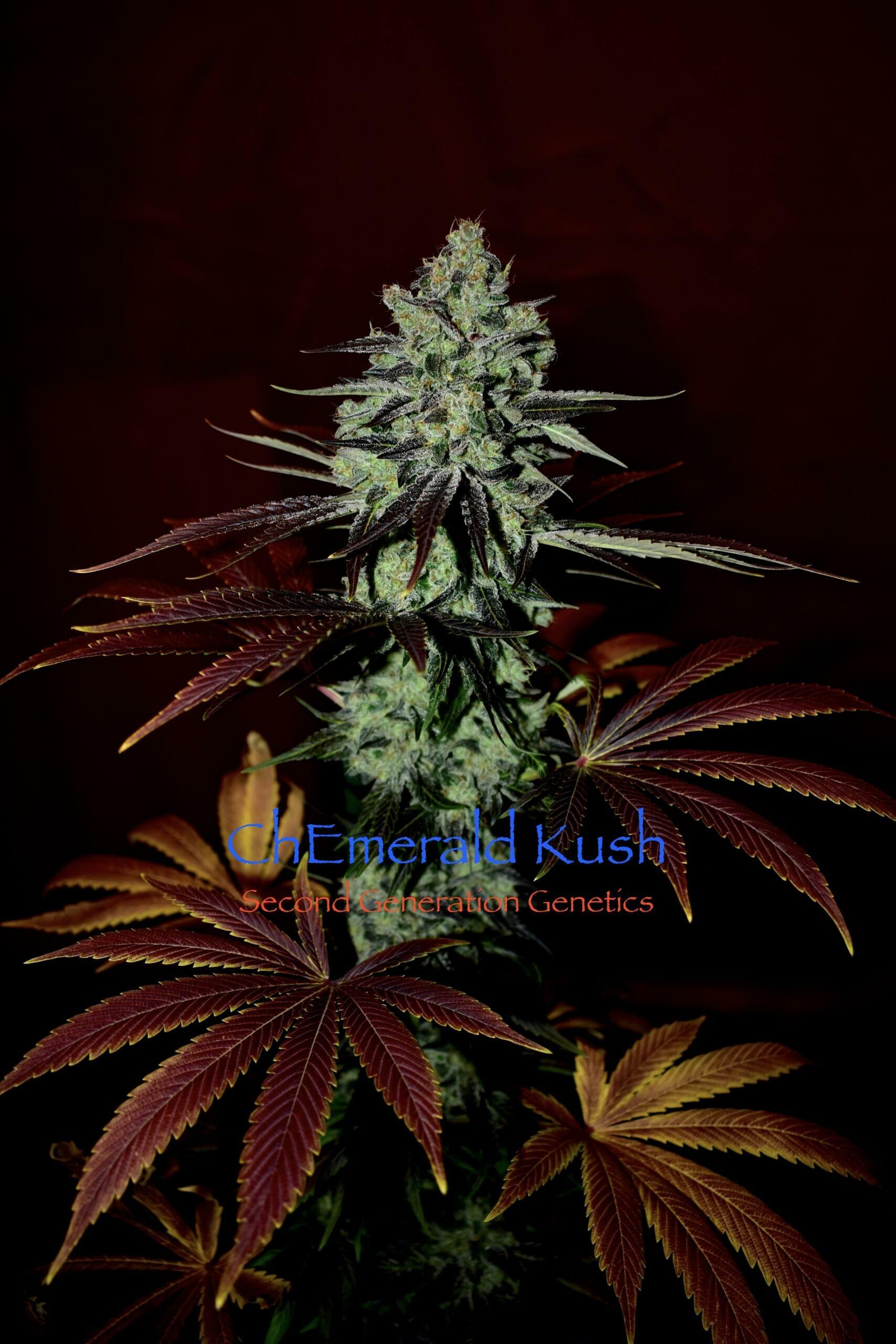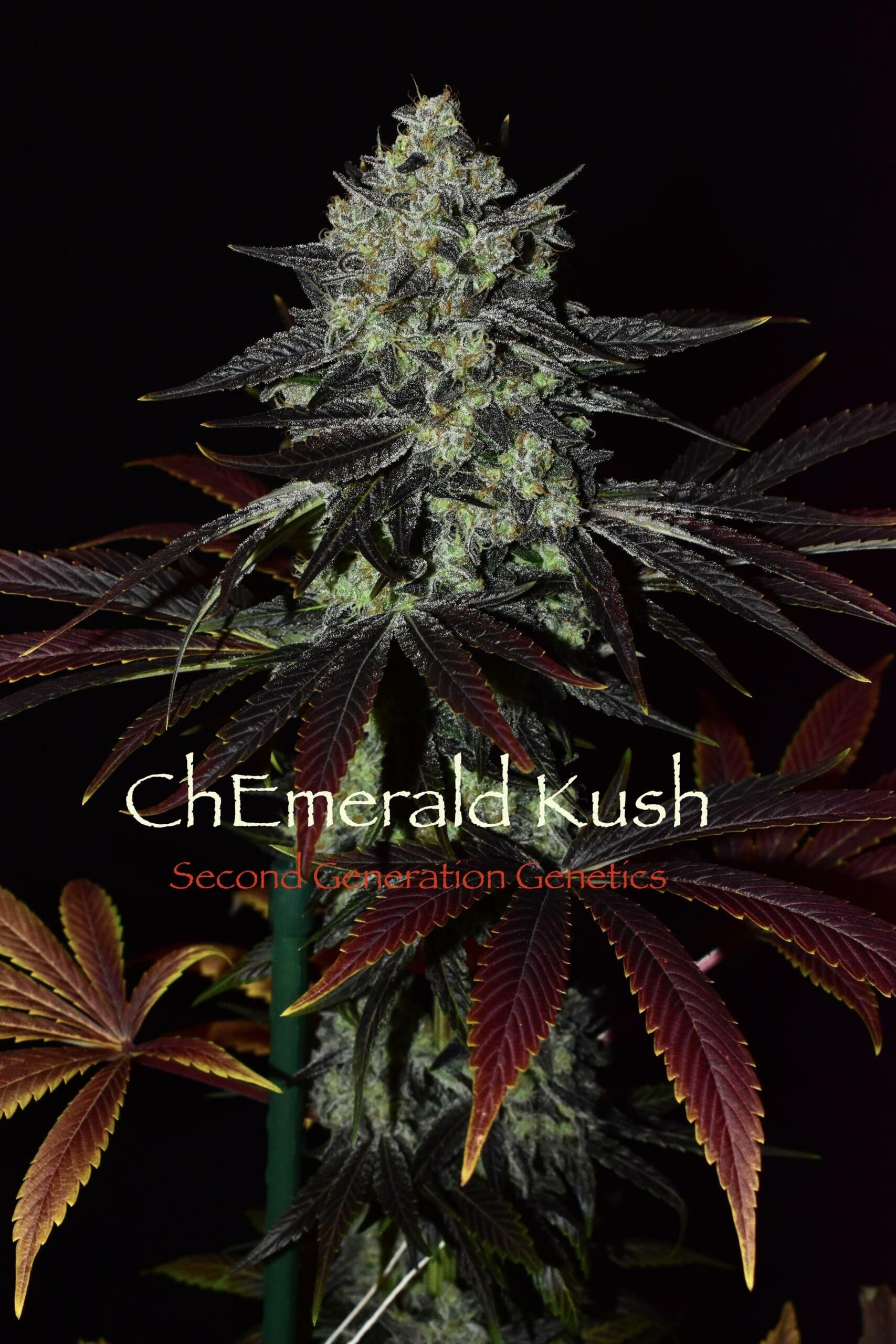 Chem and Cocoa? Yes, please!Second Generation Genetics’ ChEmerald Kush is an Indica dominant F1 hybrid cross of Chem. 4 (mother) and F5 Cocoa Kush (father).Flowering Time: Approximately 75-85 days.Production: The ChEmerald Kush produced medium well to heavy in testing. The females produce fluffy but compact and large colas covered in resin.Several plants in testing produced very large colas and flowers all the way up the plant.Flowers stink of Sour Diesel and Chemdog with notes of vanilla and candy and Chem.13 Regular Photoperiod Seeds per pack!