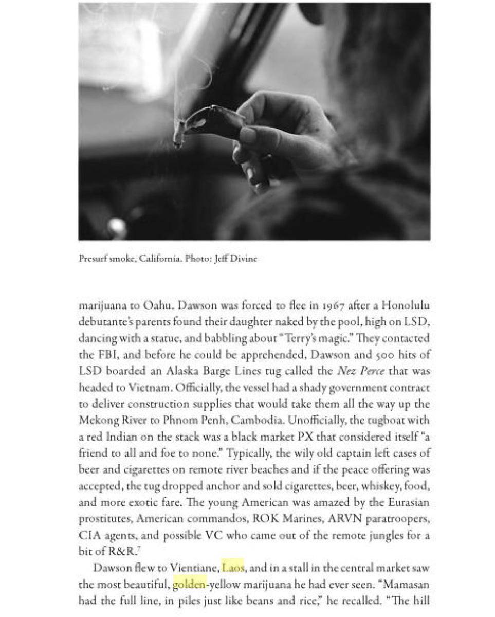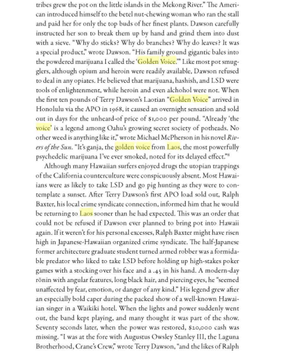 “Dawson flew to Vientiane, Laos, and in a stall in the central market, saw the most beautiful, golden-yellow marijuana he had ever seen. “Mamasan had the fall line, in piles just like beans and rice,” he recalled. “The hill tribes grew the pot on the little islands in the Mekong River.” The American introduced himself to the betel nut-chewing woman who ran the stall and paid her for only the top buds of her finest plants. Dawson carefully instructed her son to break them up by hand and grind them into dust with a sieve. “Why do sticks? Why do branches? Why do leaves? It was a special product.” wrote Dawson. “His family ground gigantic bales into the powdered marijuana I called the ‘Golden Voice.” Like most pot smugglers, although opium and heroin were readily available, Dawson refused to deal in any opiates. He believed that marijuana, hashish, and LSD were tools of enlightenment, while heroin and even alcohol were not. When the first ten pounds of Terry Dawson’s Laotian “Golden Voice” arrived in Honolulu via the APO in 1968, it caused an overnight sensation and sold out in days for the unheard-of price of $1,000 per pound. “Already ‘the voice is a legend among Oahu’s growing secret society of potheads. No other weed is anything like it,” wrote Michael MePherson in his novel Rigers of the Sun. “It’s ganja, the golden voice from Laos, the most powerfully psychedelic marijuana I’ve ever smoked, noted for its delayed effect.”*