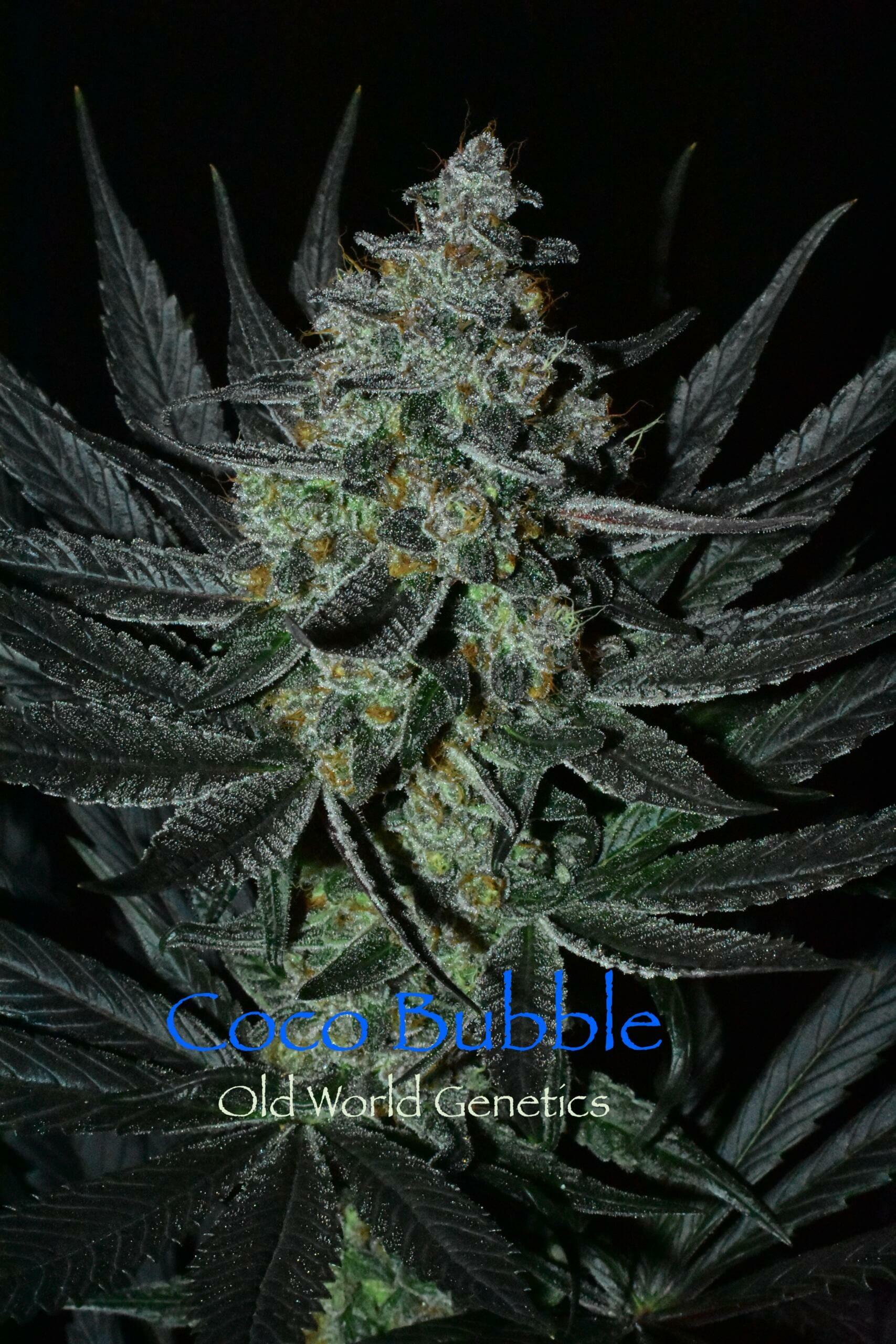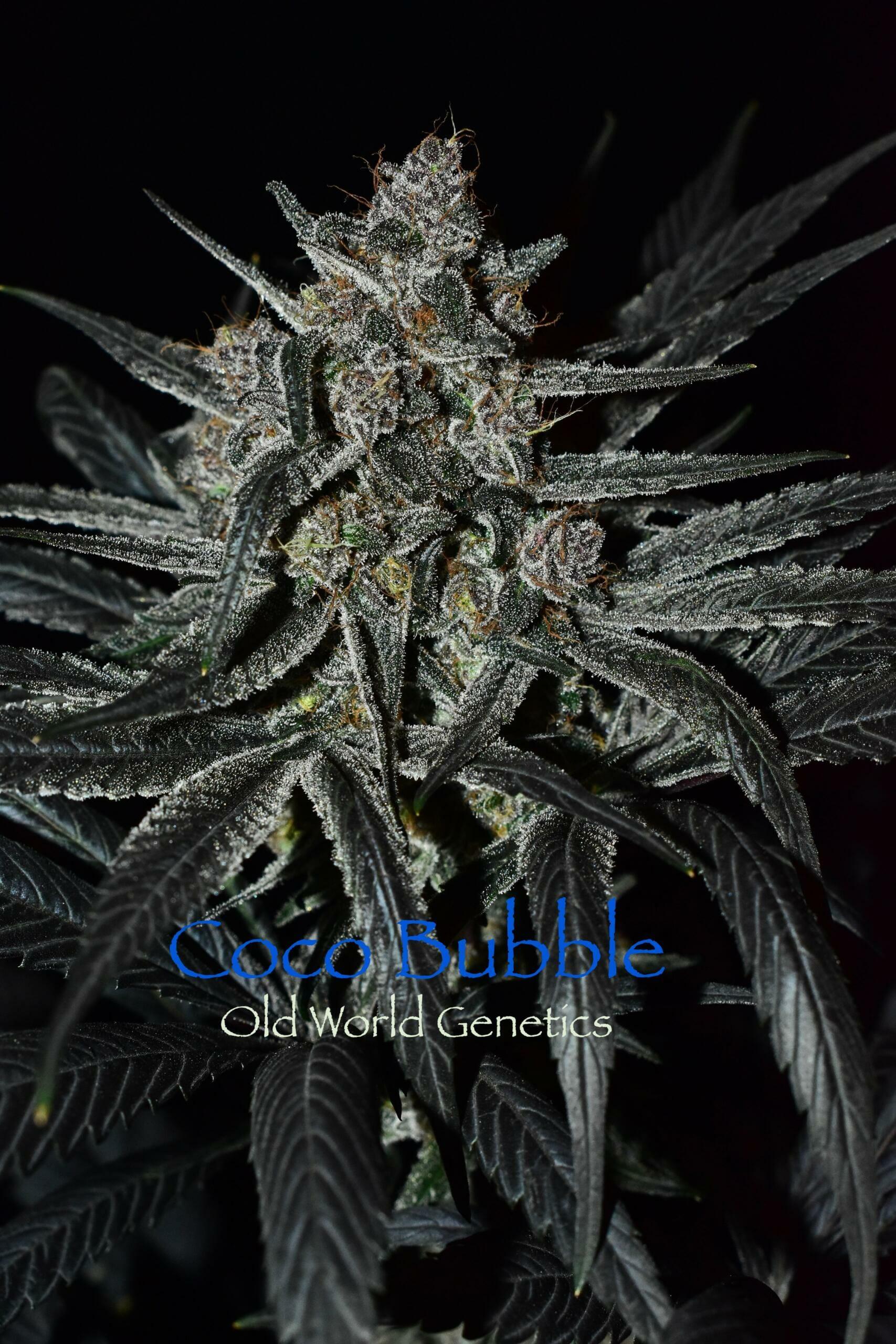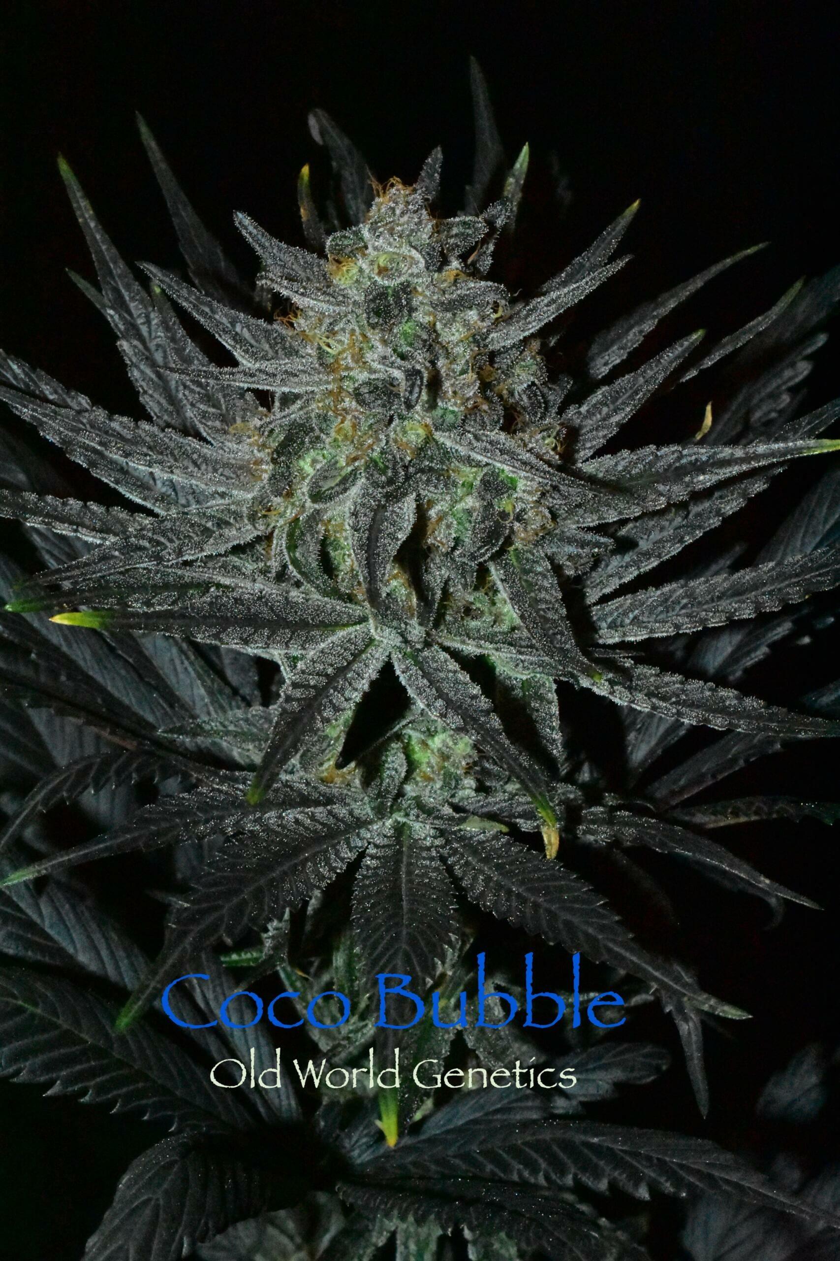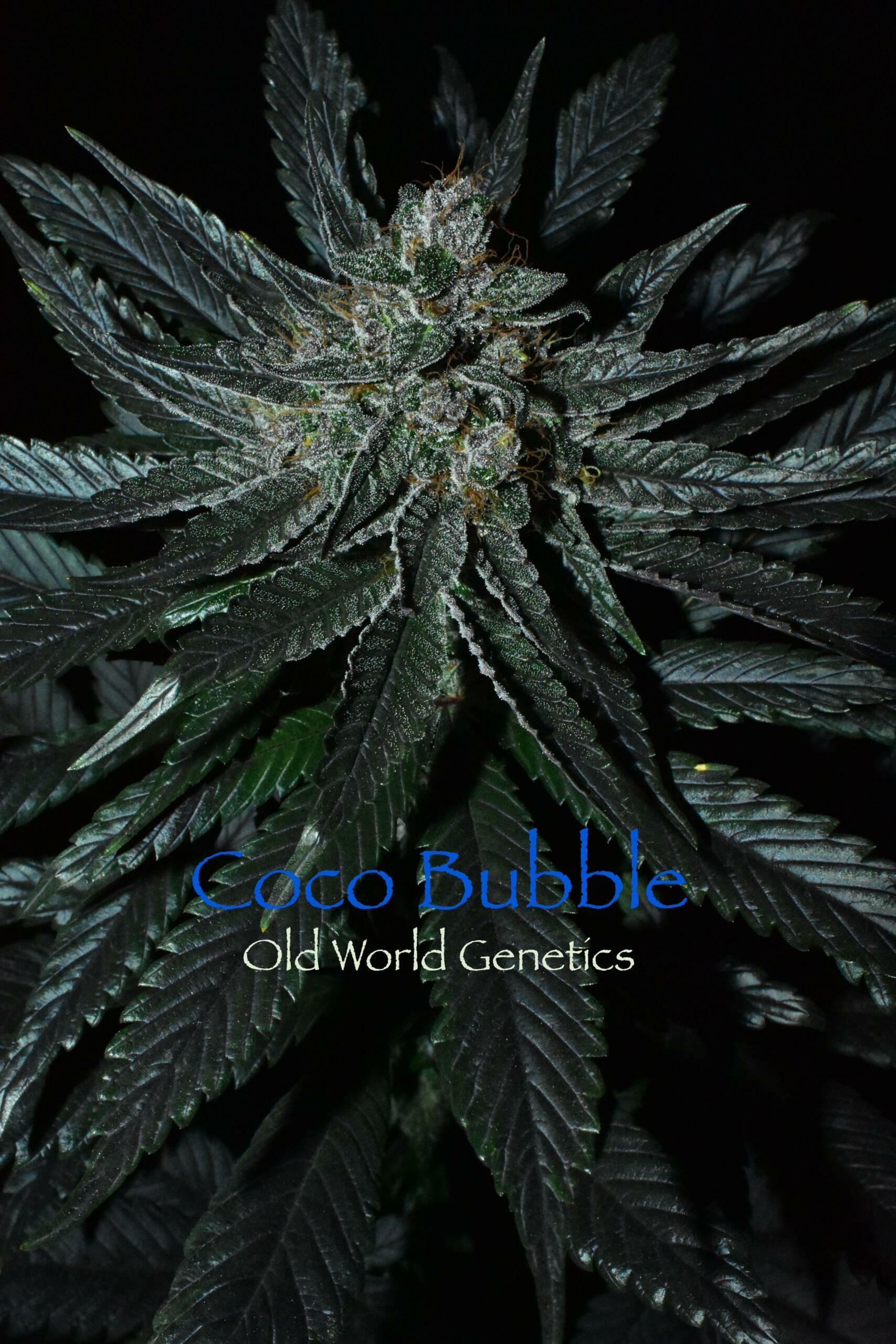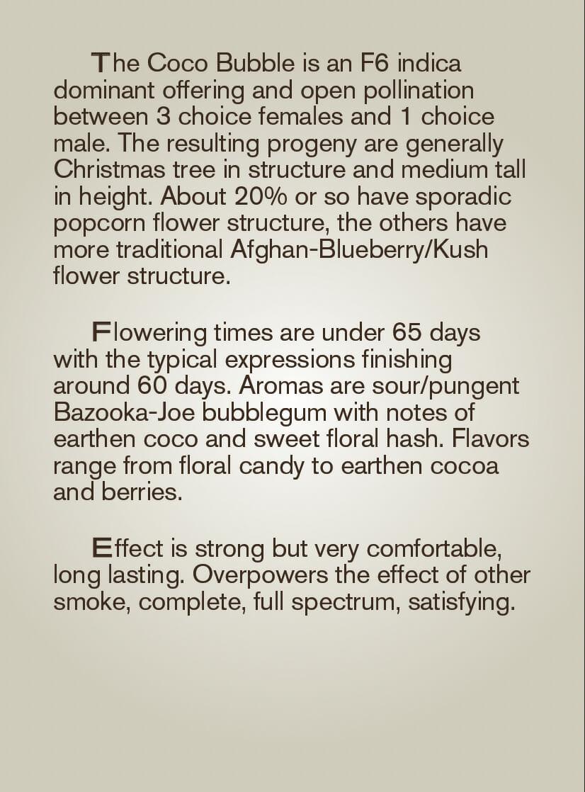 The Coco Bubble is an F6 indica dominant offering and open pollination between 3 choice females and one choice male. The resulting progeny are generally Christmas tree in structure and medium tall in height. About 20% or so have sporadic popcorn flower structure, the others have more traditional Afghan-Blueberry/Kush flower structure. Flowering times are under 65 days with the typical expressions finishing around 60 days. Aromas are sour/pungent Bazooka-Joe bubblegum with notes of earthen coco and sweet floral hash. Flavors range from floral candy to earthen coco and berries. Overpowers the effect of other smoke, complete, full spectrum, satisfying.Linage: F5 Cocoa Kush x F5 Cocoa Kush10 Regular Photoperiod Seeds per pack!
