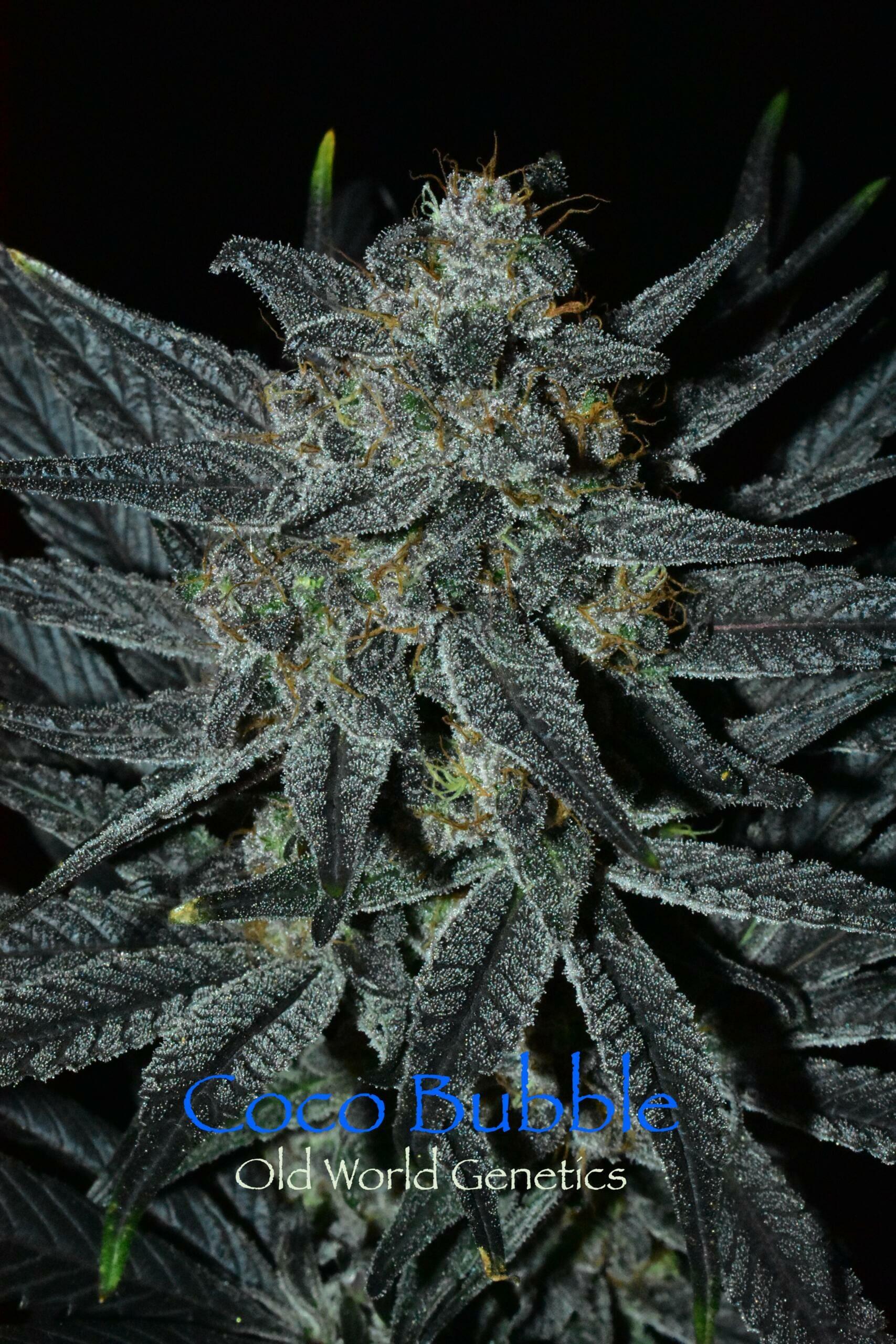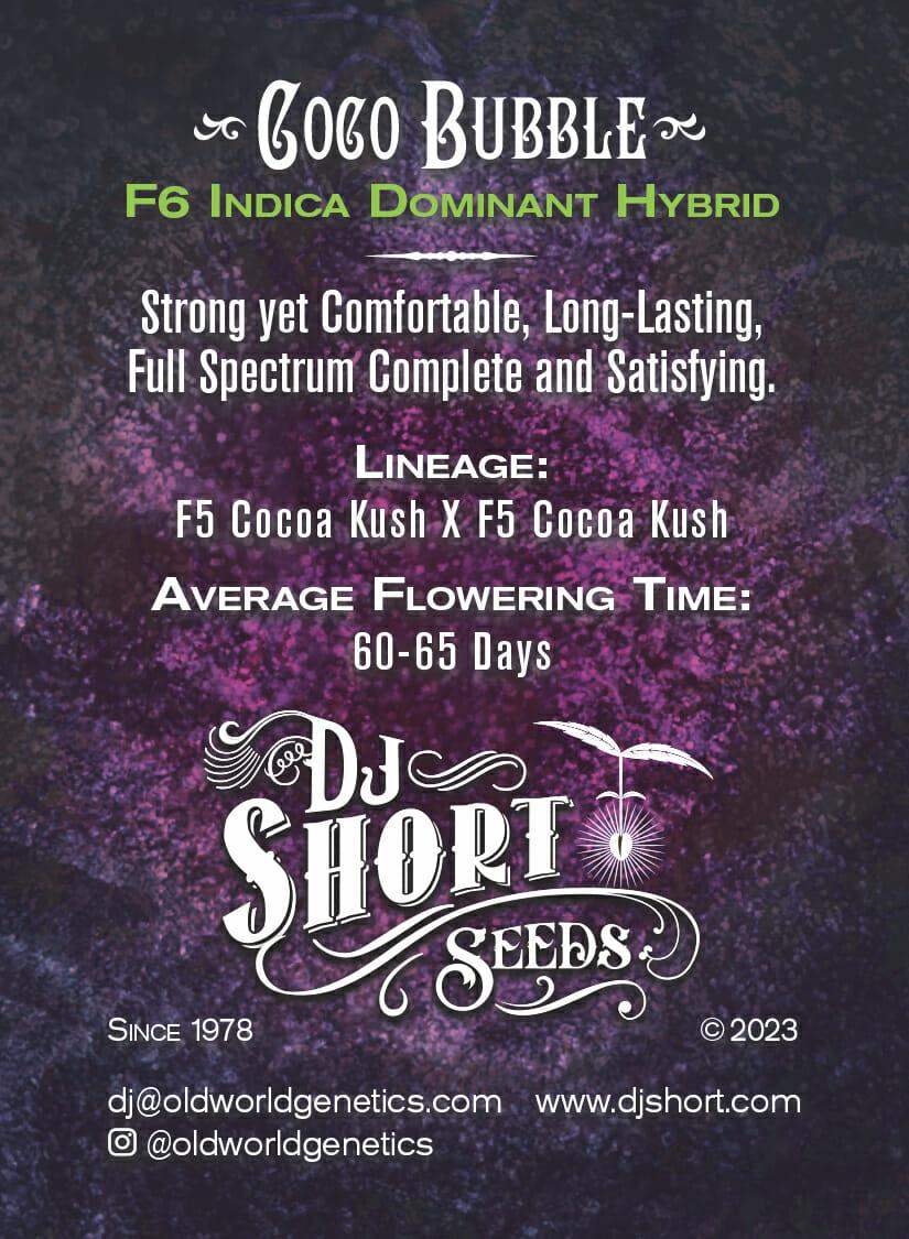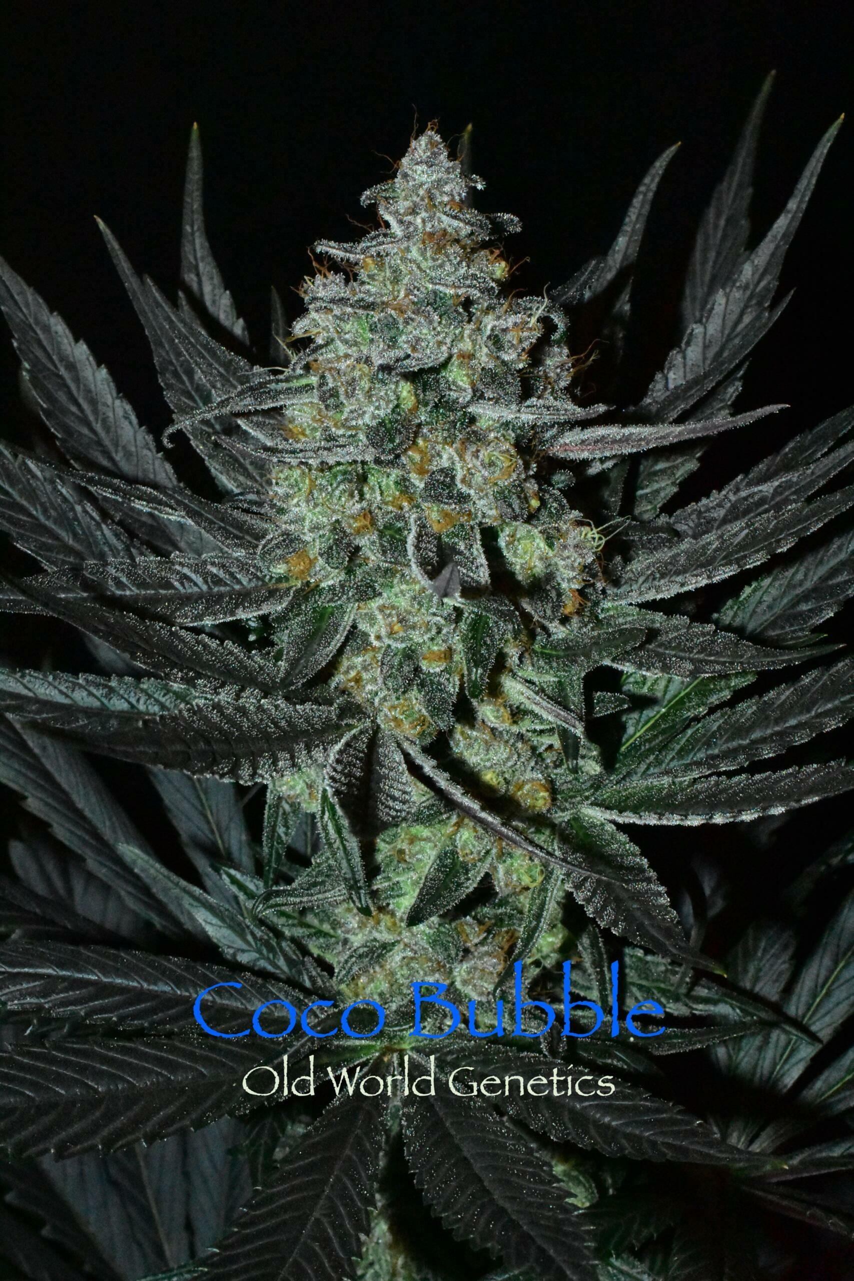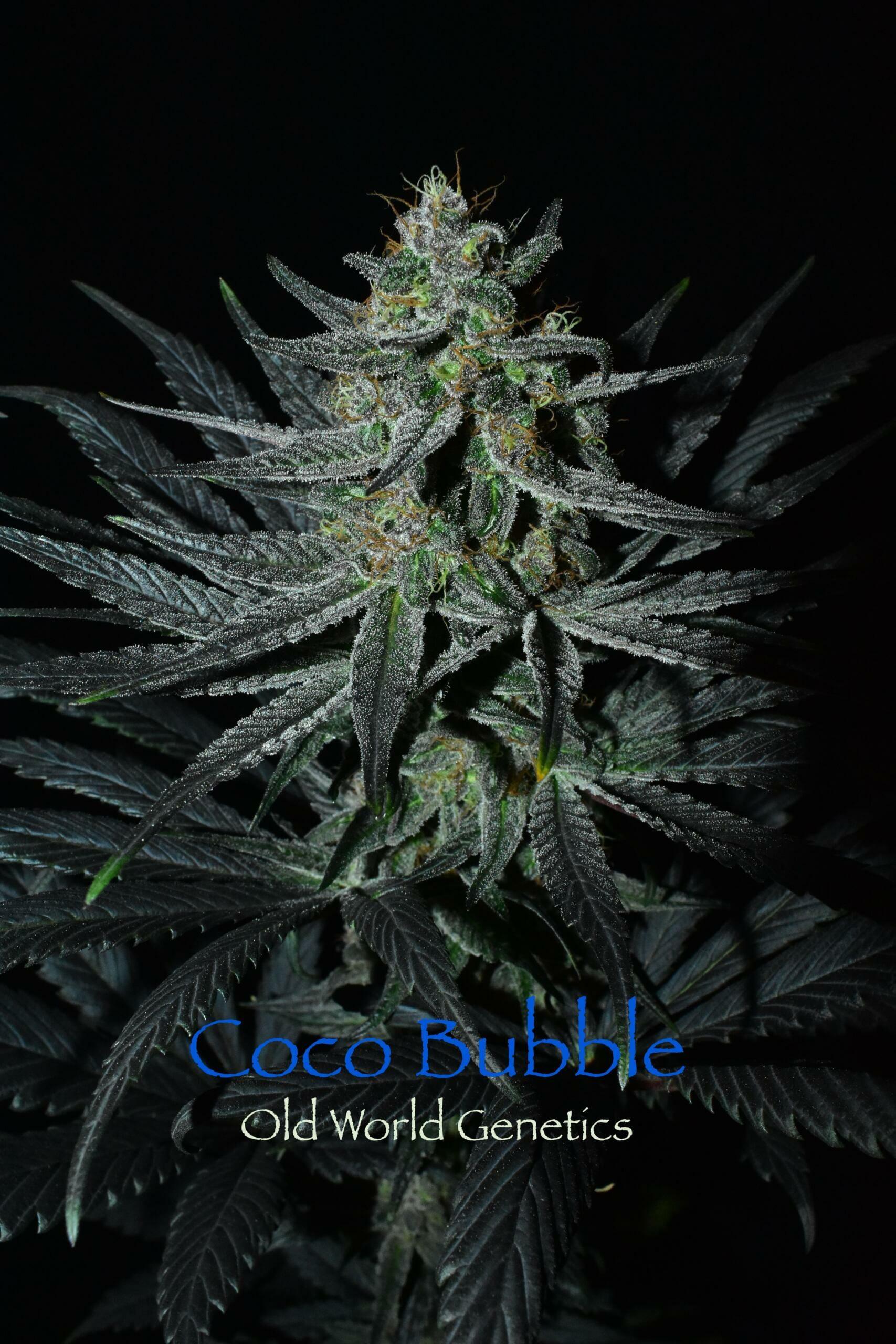 The Coco Bubble is an F6 indica dominant offering and open pollination between 3 choice females and one choice male. The resulting progeny are generally Christmas tree in structure and medium tall in height. About 20% or so have sporadic popcorn flower structure, the others have more traditional Afghan-Blueberry/Kush flower structure. Flowering times are under 65 days with the typical expressions finishing around 60 days. Aromas are sour/pungent Bazooka-Joe bubblegum with notes of earthen coco and sweet floral hash. Flavors range from floral candy to earthen coco and berries. Overpowers the effect of other smoke, complete, full spectrum, satisfying.Linage: F5 Cocoa Kush x F5 Cocoa Kush10 Regular Photoperiod Seeds per pack!