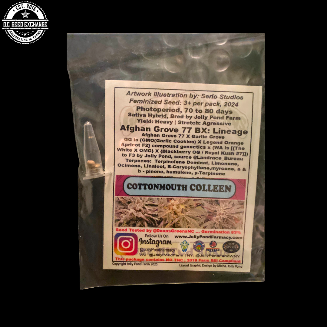 Cottonmouth Colleen is a highly anticipated release from the Jolly Pond Farms’ Garlic Pail Kids series! This Sativa-Hybrid cross brings together the potent genetics of Afghan Grove 77 and Garlic Grove for a truly unique experience.