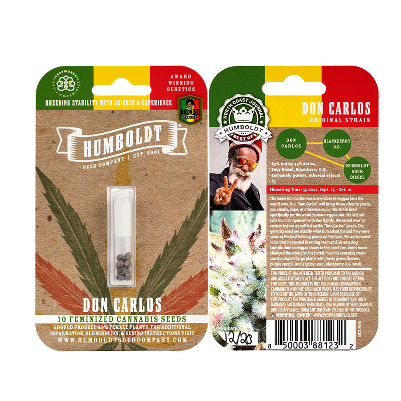 New for 2021, Year of the Exotics! The name Don Carlos means Irie vibes to reggae fans the world over. Our“Don Carlos” will bring those vibes to you as you enjoy this strain bred specifically for the world-famous reggae star. We tested over 70 crosses before we settled on the “Don Carlos” strain. The genetics used are what Don asked for and were some of the best-looking plants on the farm. We are honored to be Don’s personal breeding team. His music changed the world for the better, now his cannabis strain can too. Expect large plants with frosty green flowers, purple specks, and a gassy, sour, blackberry O.G. smell.