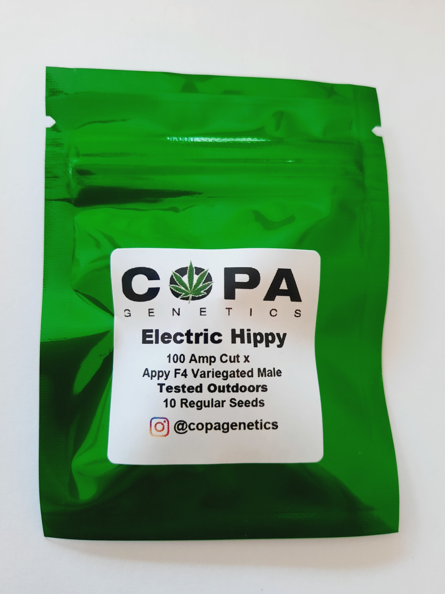 Copa Genetics Electric Hippy is an F1 photoperiod cross of 100 Amp Cut and Copa’s Appalachia (Appy) F4 variegated male!