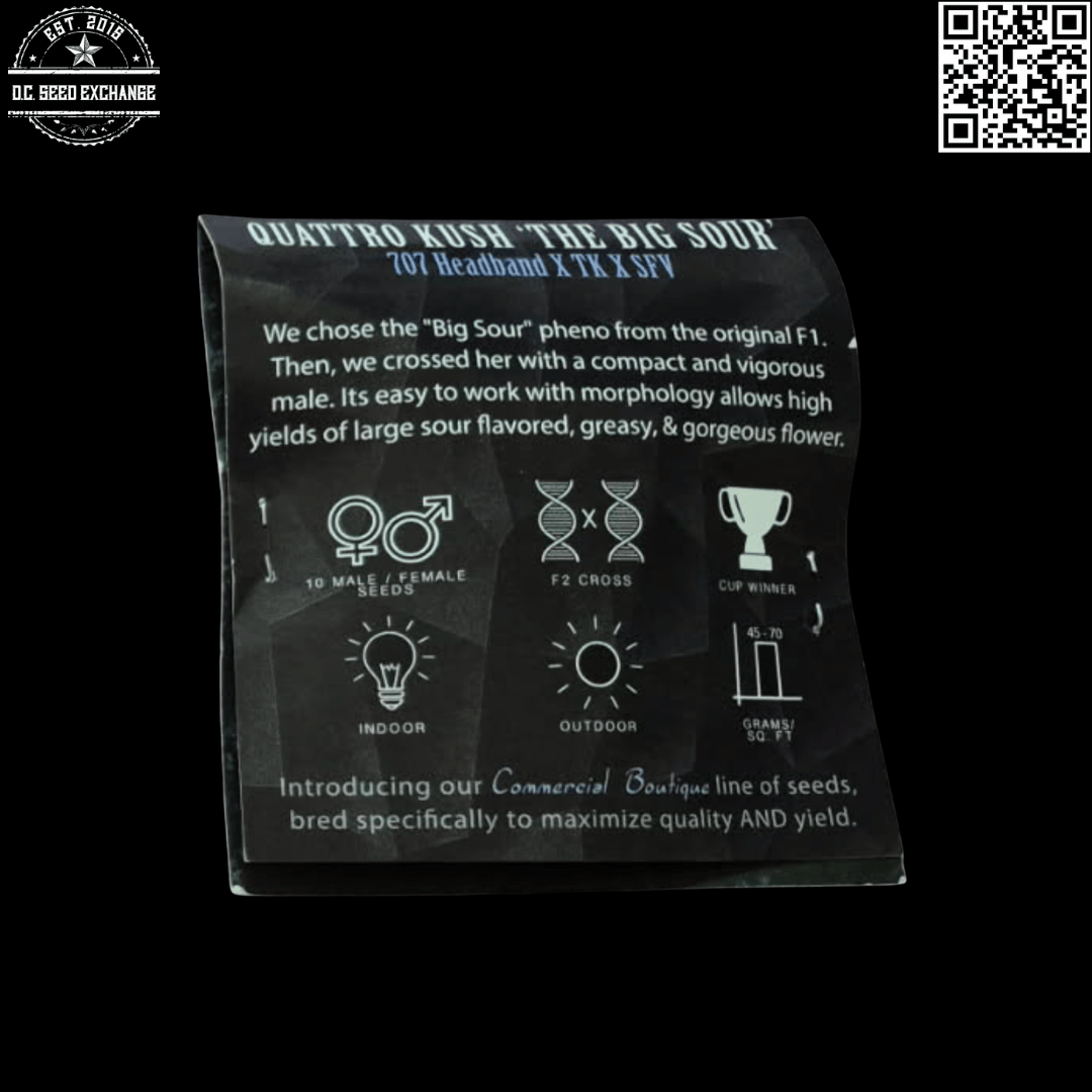 You are bidding on one original Ethos Genetics Commercial Boutique Quattro Kush “The Big Sour” (707 Headband X Triangle Kush X San Fernando Valley OG) 10 Regular Photoperiod Seeds pack!
