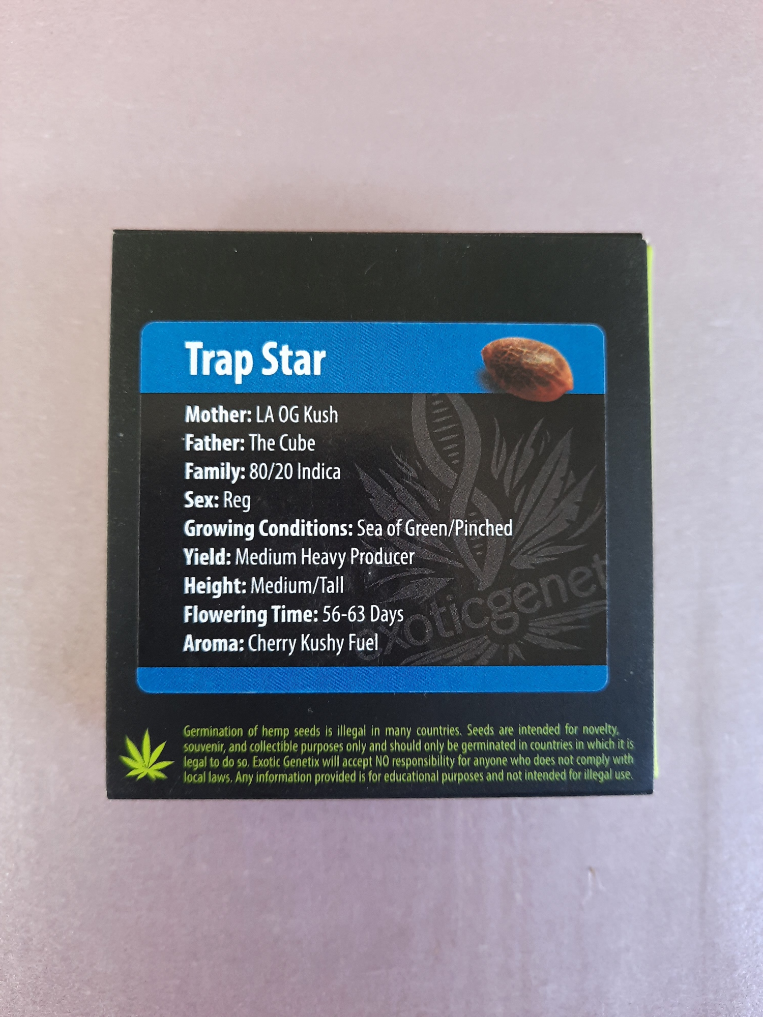 nTrap Star, bred by the esteemed Exotic Genetix, is a unique Indica-dominant strain that combines the remarkable features of its parent strains, LA OG Kush and The Cube. This strain is designed to offer the perfect blend of potency and a balanced high.