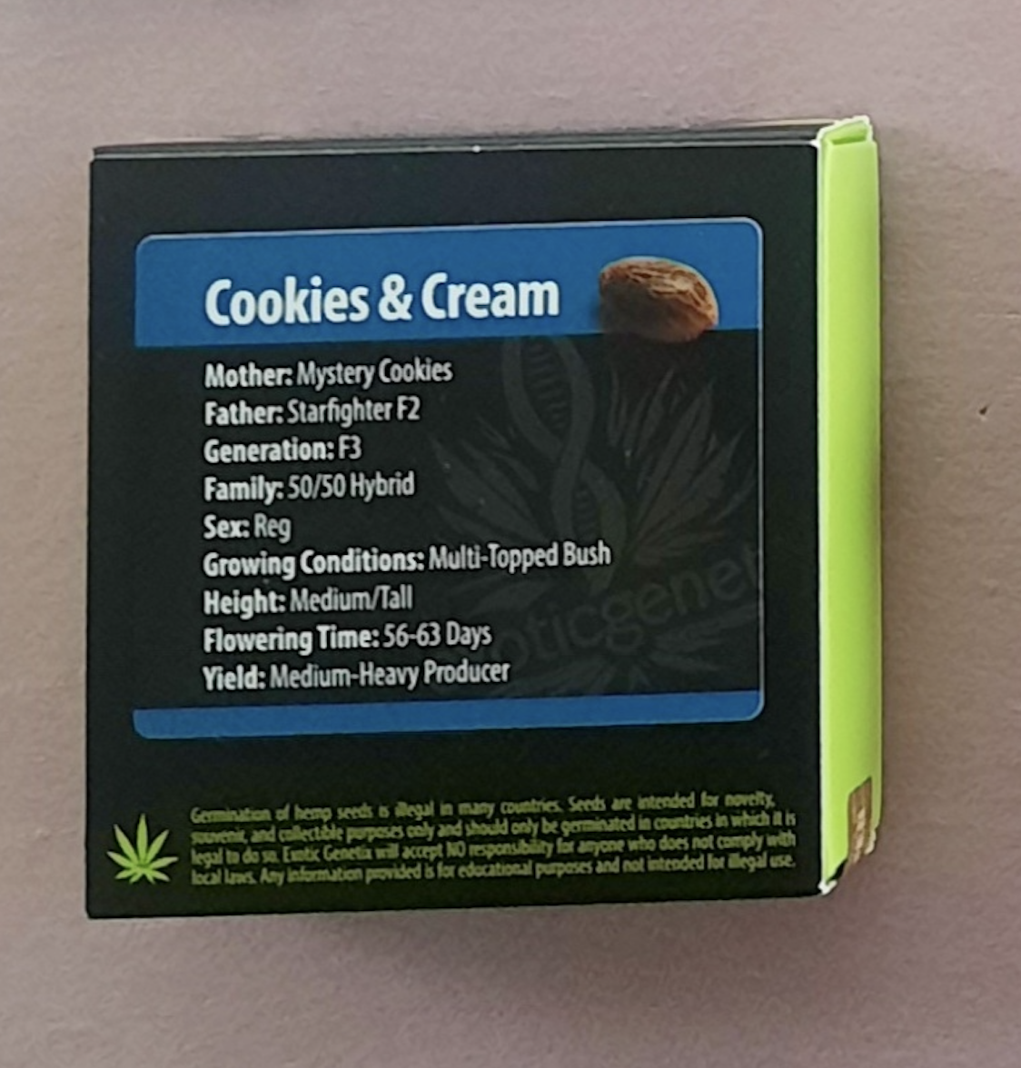 You are bidding on one rare original pack of Exotic Genetix Cookies & Cream F1 (Girl Scout Cookies x Starfighter F2) 10 Regular Photoperiod Seeds!