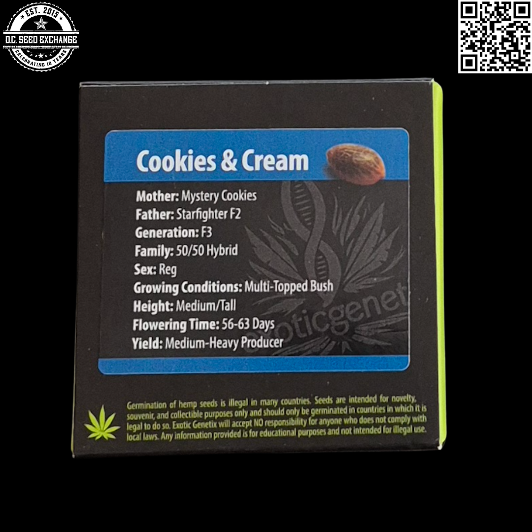 You are bidding on one rare Exotic Genetix Cookies & Cream F3 (Mystery Cookies x Starfighter F2) 10 Regular Photoperiod Seeds pack!