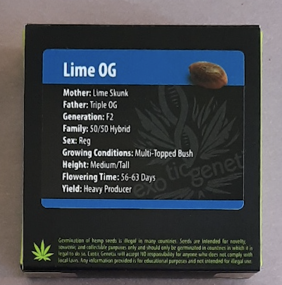 You are bidding on one pack of Exotic Genetix’s retired Lime OG F2 (Lime Skunk x Triple OG) 10 Regular Photoperiod Seeds!