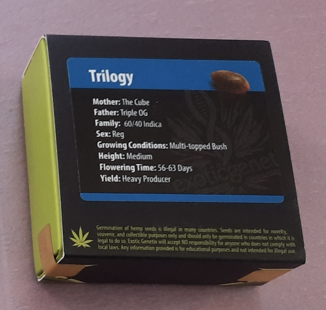nTrilogy (The Cube x Triple OG) is the original first release of Exotic’s “The Cube” genetics! “The Cube” is Starfighter F1 x Starfighter IX2!