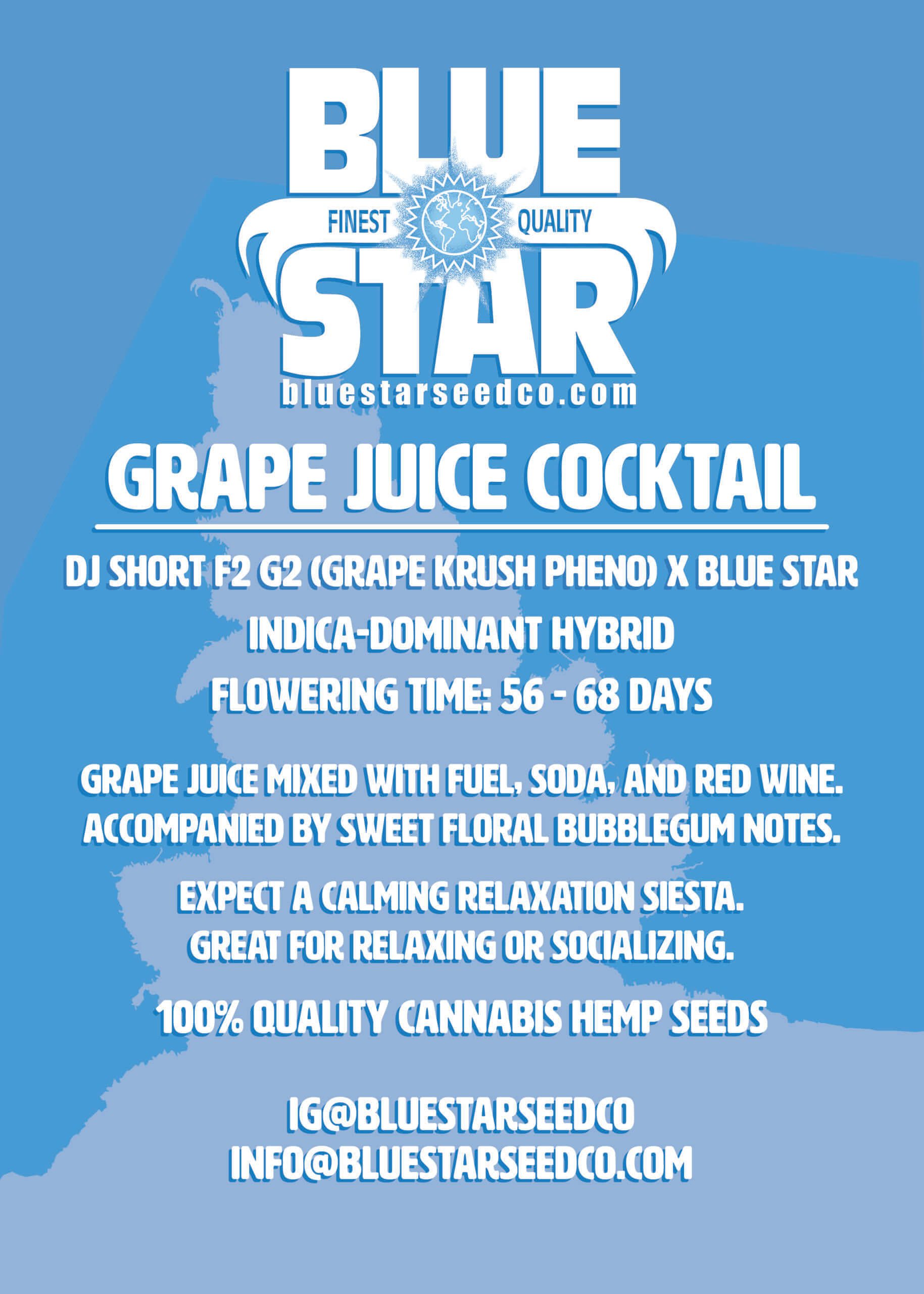 - GRAPE JUICE COCKTAIL F1 (DJ SHORT F4 G2 “GRAPE KRUSH PHENO” X BLUE STAR) 9 Feminized Seeds