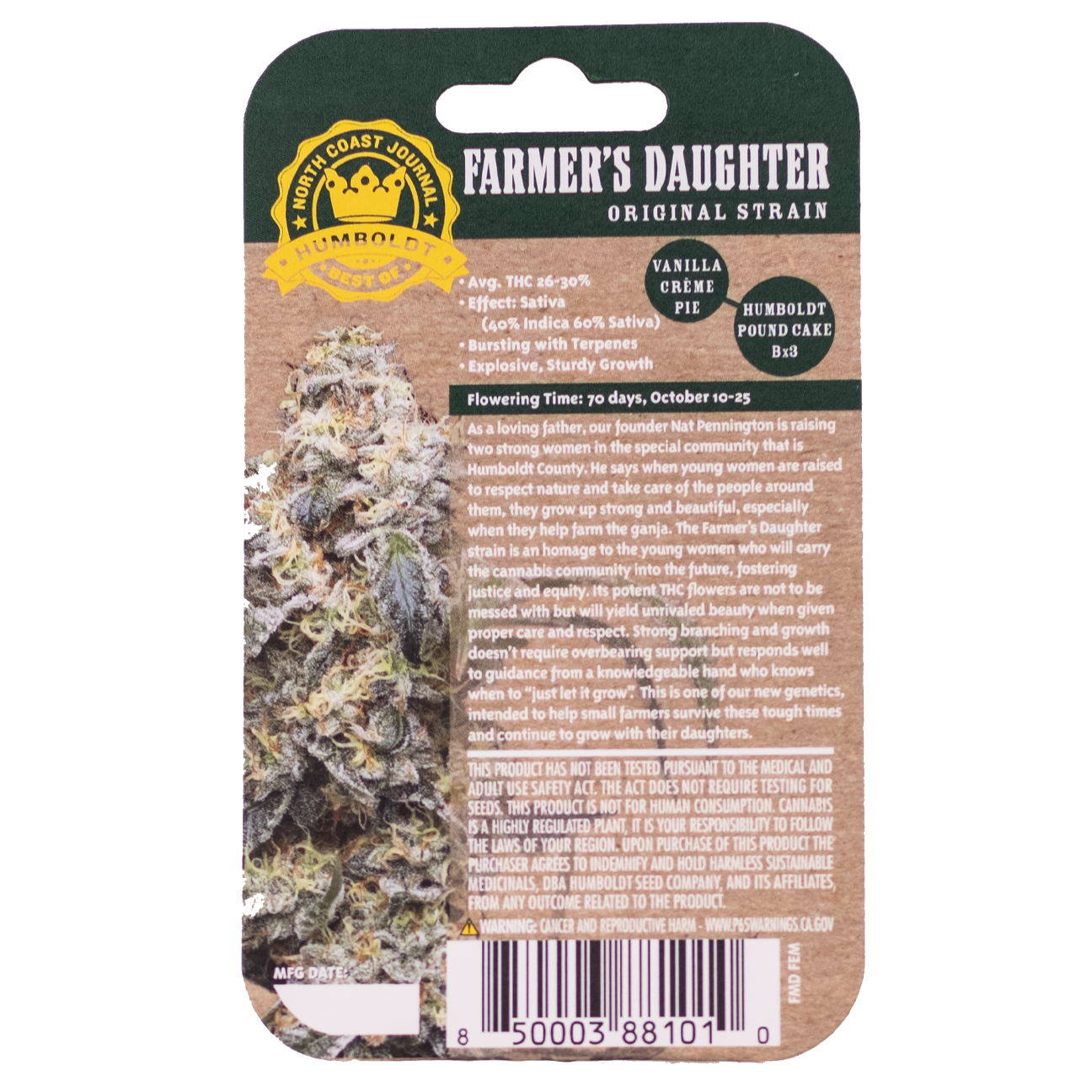 As a loving and protective father, our founder Nat Pennington is raising two strong women in the special community that is Humboldt County. Nat says when young women are raised to respect nature and take care of the people around them that they grow up strong and beautiful, especially when they help to farm the ganja. The Farmer’s Daughter strain is an homage to the young women who will hopefully carry the cannabis community into the future, fostering justice and equity. The strain’s potent flowers are not to be messed with but will yield unrivaled beauty when given the proper care and respect. Strong branching and growth doesn’t require overbearing support but will respond well to guidance from a knowledgeable hand who knows when to “just let the plant grow”. This is one of our new genetics that’s intended to help small farmers survive the tough times we’re seeing in the “free market”. With genetics like this we hope that a family farm can survive another season so farmers can grow with their daughters.