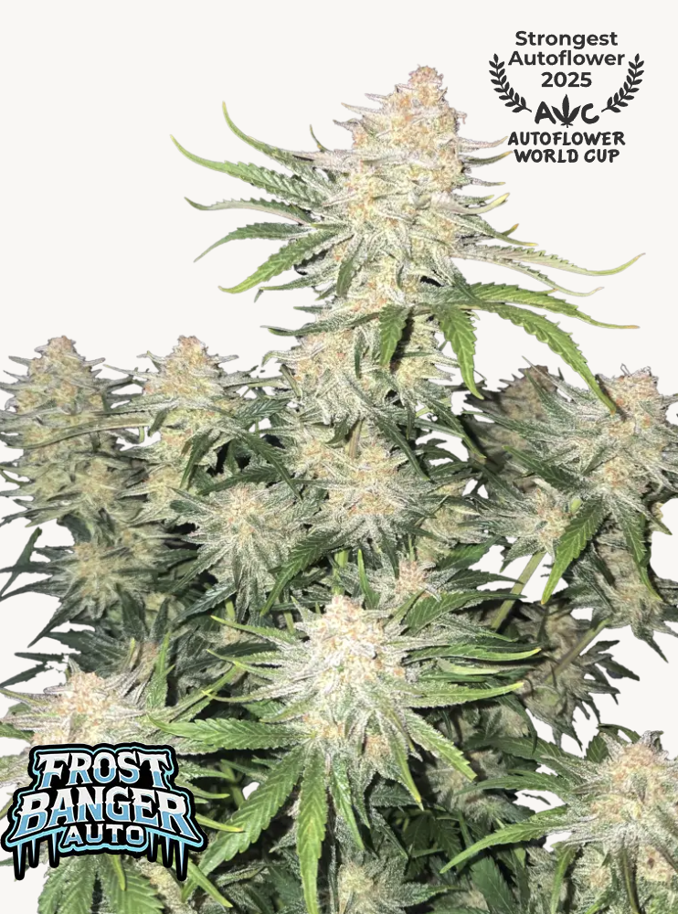 Frostbanger auto is a super-potent, super-frosty, heavyweight indica-dominant autoflower with an average 29.5% THC. She stays compact, kicks into flower by week four, and quickly produces a moderate harvest of dense, tight, resin-soaked buds that glitter like fresh snow in a sparkling winter wonderland. Created for connoisseurs who crave next-level trichome production, Frostbanger Auto is highly resilient, meaning she’s easy-to-grow whether you’re new to growing weed or have years of experience. Her compact structure is perfect for tight indoor spaces, where she’ll reach heights of 70-120cm. Just keep in mind, this strain’s dank, pungent odor is super strong—meaning a carbon filter is a must to mask the aroma in any grow room and she’ll make her presence known when grown outside. You can expect a healthy harvest from this trichome-studded beauty that’s known to produce 450-550 gr/m2 inside and 60-200 gr/plant outdoors. Smoking Frostbanger’s glistening flowers produces a smooth, ultra-thick vapor that rolls smoothly across the palate with sweet, creamy fruit flavor, delivering a hard-hitting wave of calm relaxation almost immediately that settles deep into the body. This is the ideal strain for evening use, unwinding at the end of the day, or for simply experiencing tranquil physical bliss and an unbound calmful state of mind. Optimized for outrageous trichome production and covered in frost so thick you can hardly see the buds—this is the future of heavy-hitting, high-resin autoflowers.