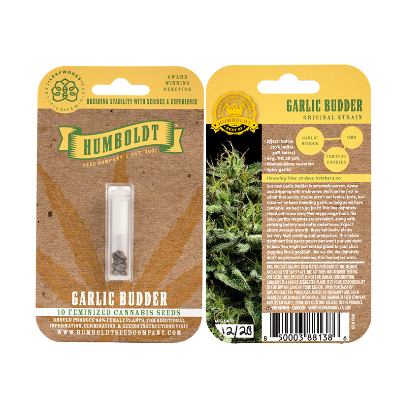 New for 2021, Year of the Exotics! HSCo’s new Garlic Budder is extremely potency, dense, and dripping with trichomes. We’ll be the first to admit that savory strains aren’t our typical forte, but since we’ve been breeding garlic as long as we have cannabis, we had to go for it! This line stood out in our 2019 Phenotype mega-hunt: the spicy garlicky terpenes are prevalent, along with enticing buttery and nutty undertones. Expect above-average growth, with tall bushy plants that are high yielding and productive. This Indica dominant line packs power, you might just end up glued to your chair giggling like a goofball as we did. We definitely don’t recommend smoking this before work.