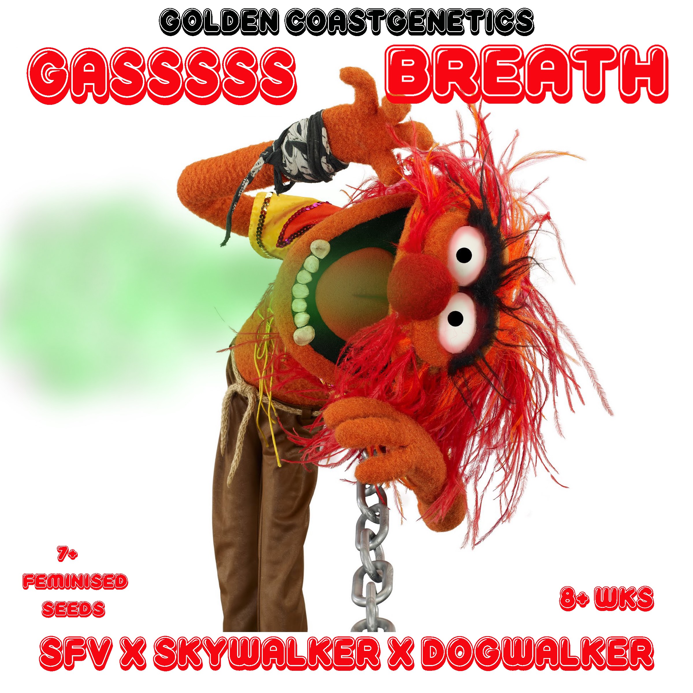 Get ready for an explosive new F1 hybrid with Golden Coast Genetics Gas Breath! This powerhouse cross brings together a reversed Dog Walker OG with a potent San Fernando Valley OG Skywalker Female, creating a true connoisseur’s delight.