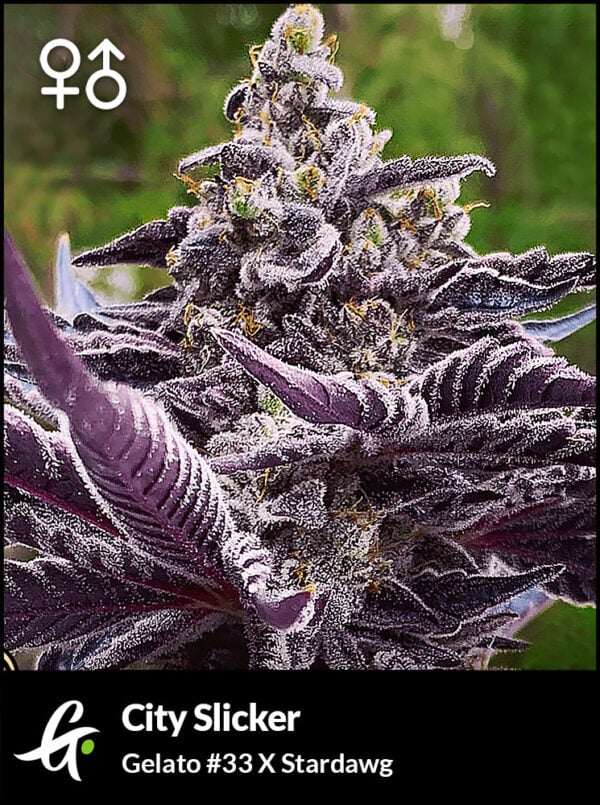 nCity Slicker is a top-tier hybrid with an elite pedigree. This variety combines Gelato 33 and Stardawg—two proven strains renowned for their potency and aroma. City Slicker brings out the best traits of each parent strain, offering the exotic color, flavor, and bag appeal of Gelato 33 and the vigorous growth and abundant yield of Stardawg.