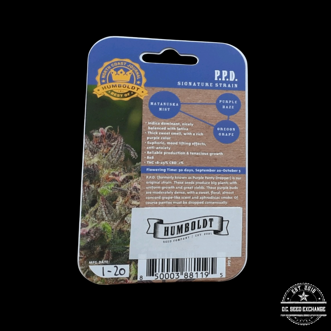 nP.P.D (formerly known as Purple Panty Dropper) is Humboldt Seed Company’s original strain. These seeds produce big plants with uniform growth and great yields. These purple buds are moderately dense, with a sweet, floral, almost concord grape-like scent