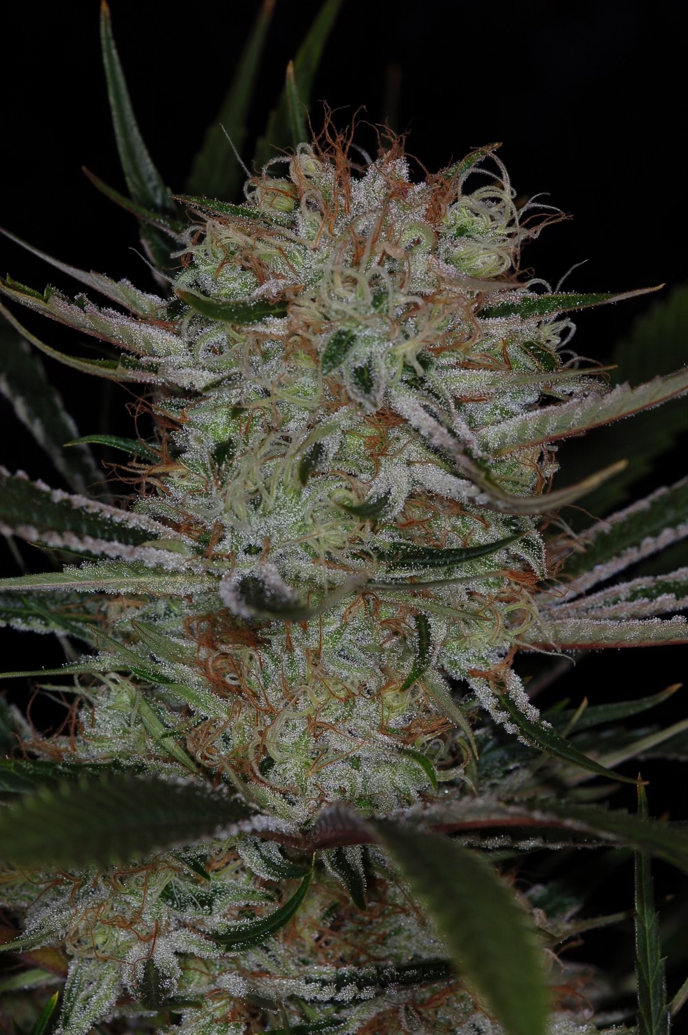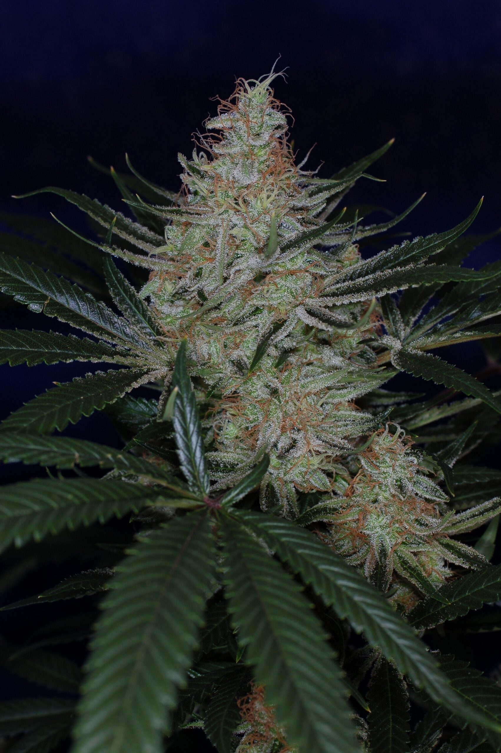 Phenotypes: Dense, resin-coated colas with triangle-shaped “Xmas tree” buds; one rare pheno shows long “soda-bottle” colas
