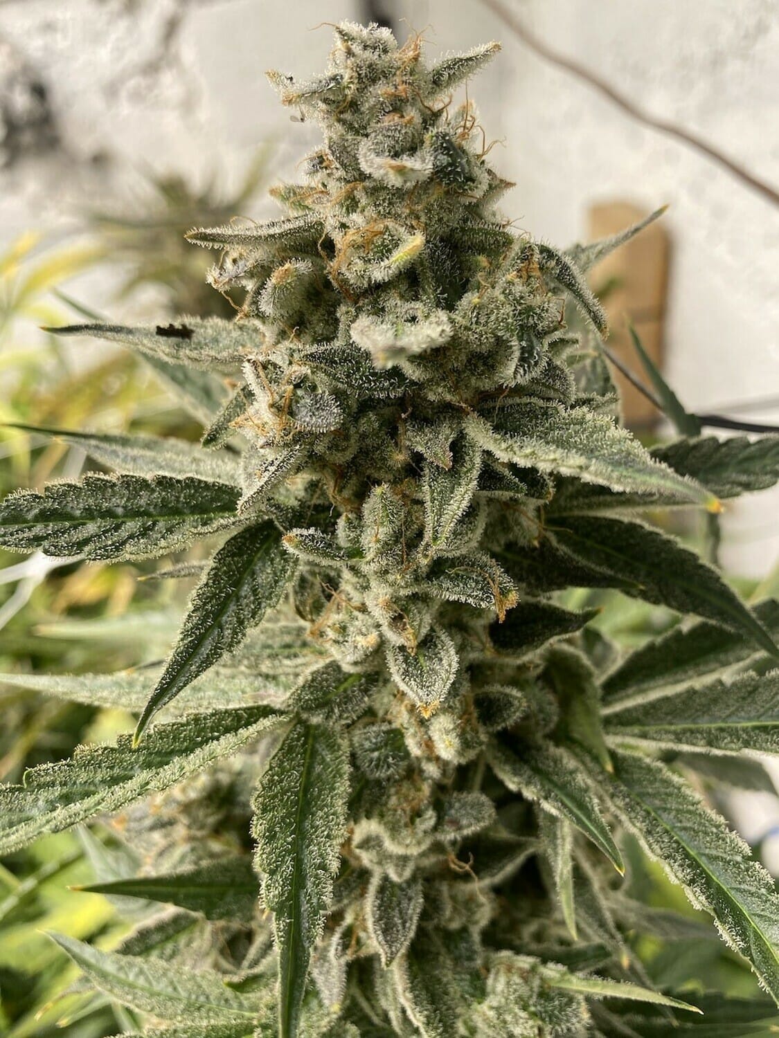 3-3.5 ft tall The terpene profile has strong nose burning rocket fuel and burnt tires with a hint of body odor and patchouli reminiscent of a Grateful Dead Show parking lot (while Jerry was still alive). the plant has symmetrical branching with swollen calyx it has a good calyx to leaf ratio and resinous sticky buds.