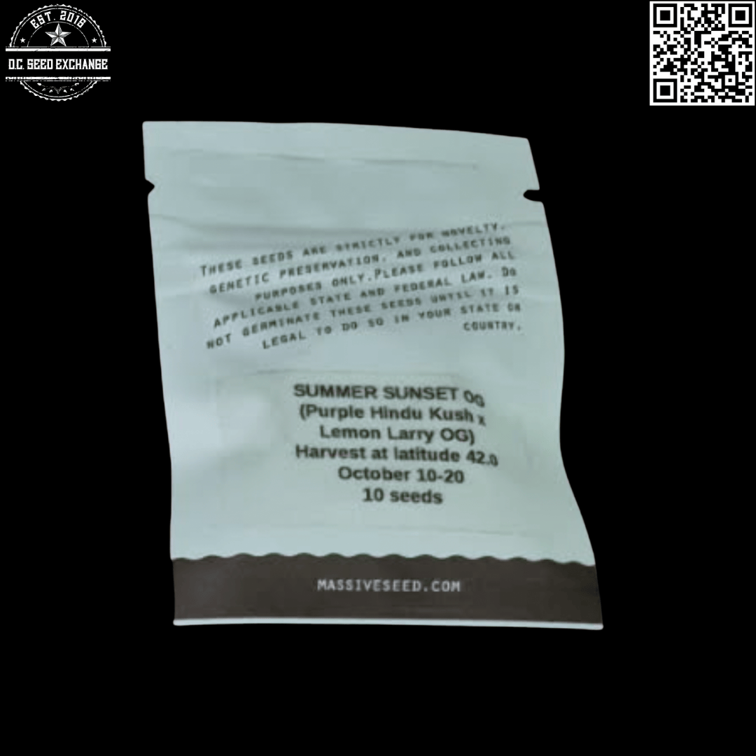 You are bidding on one original Massive Seeds Summer Sunset OG F1 (Purple Hindu Kush x Lemon Larry OG) 10 Regular Photoperiod Seeds pack!