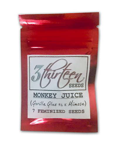 Monkey Juice is a cross of clone-only Gorilla Glue #4 crossed with the famed Mimosa by Symbiotic Genetics. When a “Mimosa” male plant with a robust citrus juice smell collides with a potent, terp-filled strain such as GG#4 -you can expect great influence from both strains. For those that may be familiar with how the GG#4 grows, the “Mimosa” addition really provides more control to the Glue in regards to height as well as refining the flavors and aromas. The stretch and lateral side branching are dialed back a bit aiding to those with height restrictions. Though not as tall as the GG#4, you can still anticipate a minimum of 2X stretch at flip (indoors) with the Monkey Juice.