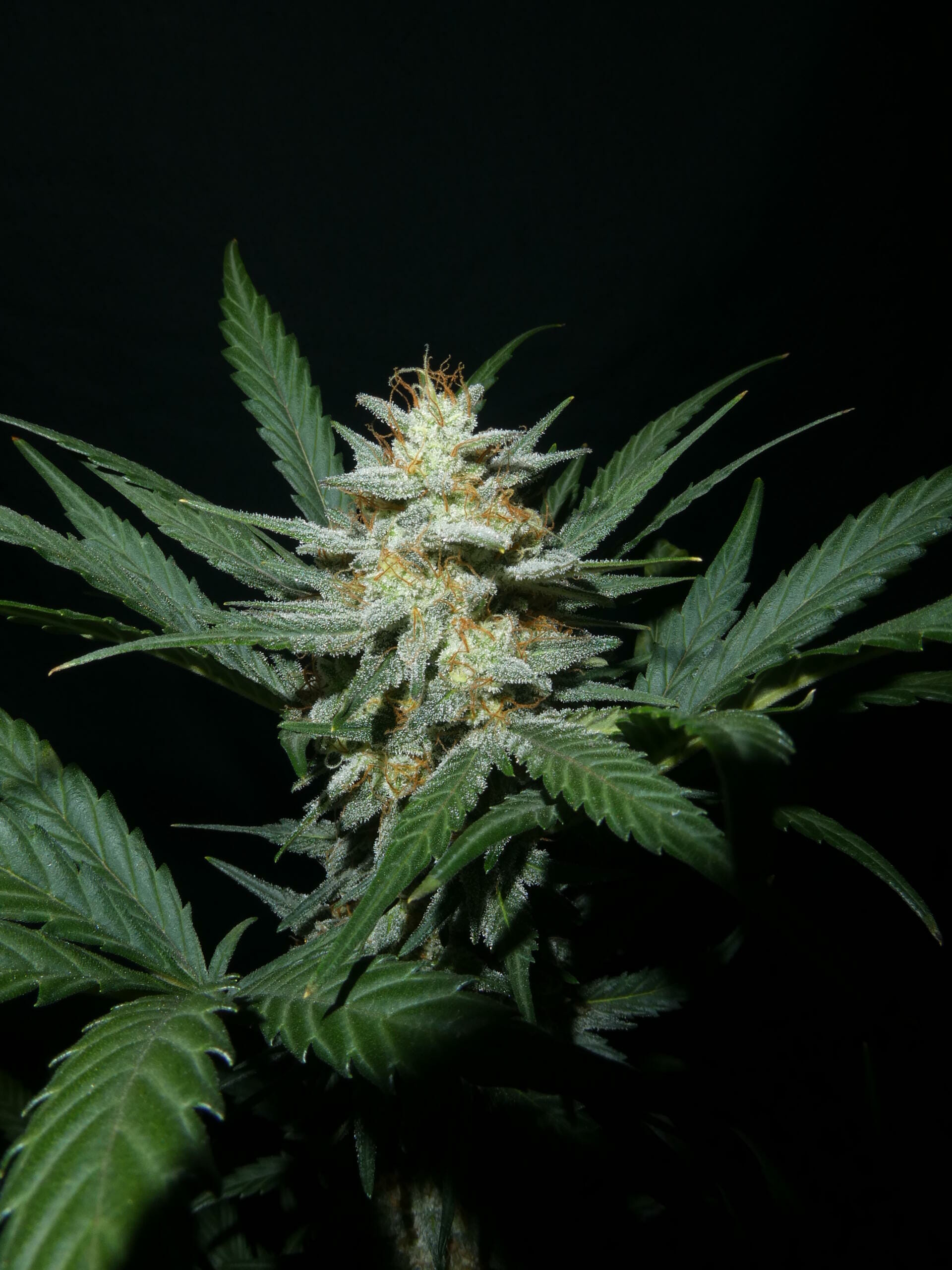 Troubled Grape from Magic was another strain we had to cross with our BlkMrrr. Big size and big flavor are to be expected from Troubled Grape. Adding to the mix is BlkMrrr’s ability to get large as well as pack on the frost. So with a good twisting of flavor, size and frost we came up with some Moon Juice. Sturdy lower branching, common in both parents translates over to the progeny making this a serious contender for those that like topping and low-stress training. For those that prefer a natural grow technique, MJ will be happy to accommodate you with large lower buds with long thick single colas. She is a performer no matter your grow style.