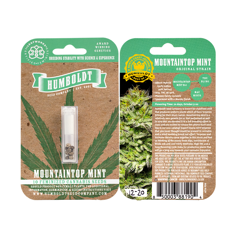 New for 2021, Year of the Exotics! HSCo is known for a stabilized seed that produces uniform plants which all have terpenes fitting for their strain names. Mountaintop Mint is a relatively new genetic for us that performed so well in 2019 that we elevated it to a full breeding effort in 2020. Expect insane mint terpenes that you never thought would be present in cannabis and a mind-numbing knock out effect. Terpenes and trichome density came together in this strain and had us thinking of snowy Swiss Alps, reminiscent of Ricola ads and cool minty freshness. High potency and long flowering cycle make for productive plants that will go a long way towards your cannabis EnjoyMint.