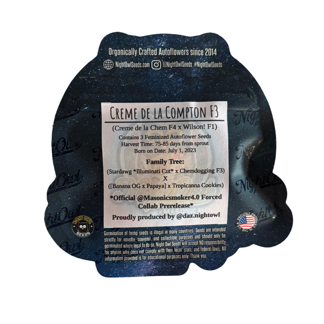 You are bidding on one rare pack of Night Owl Seeds’ Creme De La Compton F3 Feminized Autoflower Seeds!