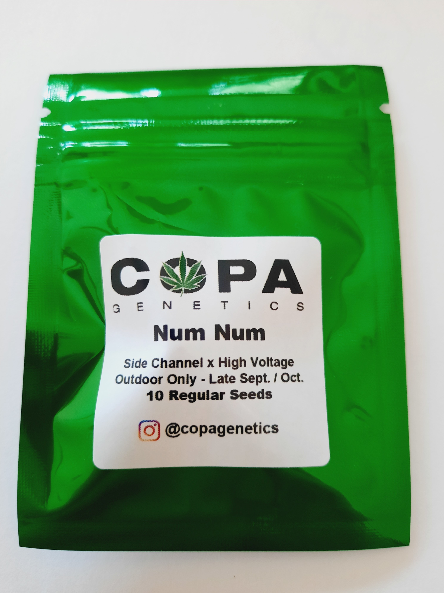 Copa Genetics Num Num is an F1 photoperiod cross of Side Channel and High Voltage!