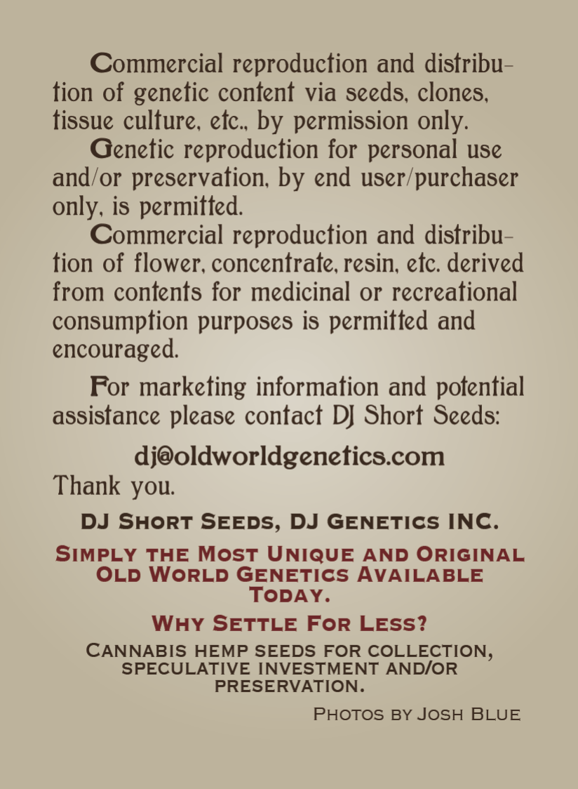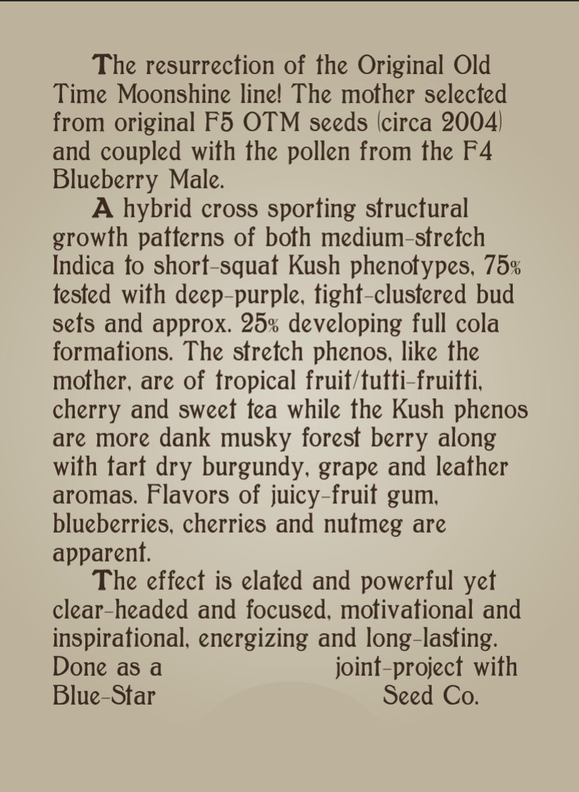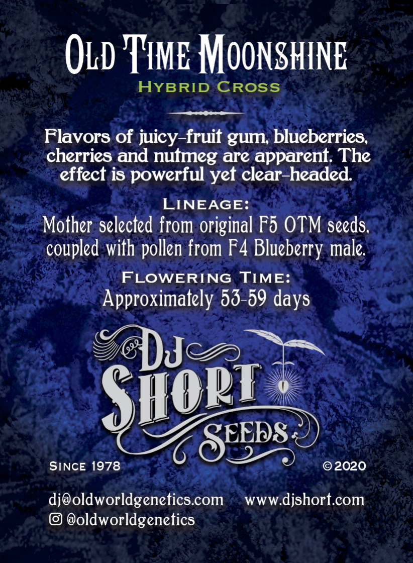 The resurrection of the Original Old Time Moonshine line! The mother was selected from original F5 OTM seeds (circa 2004) and coupled with the pollen from the F4 Blueberry Male.