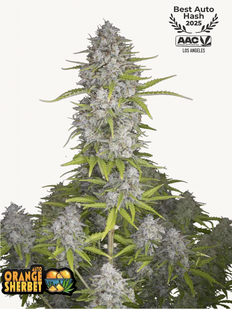Orange Sherbet Auto grows spade-shaped, light green colored buds with lots of thick orange hairs scattered all over that are encrusted with trichomes giving her a totally white appearance. On top of that, the large-sized calyxes make the big, dense buds look like they’re growing stacked on top of each other. Breaking the buds open reveals a delicious, very distinct citrus aroma of freshly squeezed tangerine and orange juice with a sharp sour almost tropical background and subtle hints of earth and pine. This unique terpene profile translates into a pungent funky citrusy gassy smell that will make your mouth water!