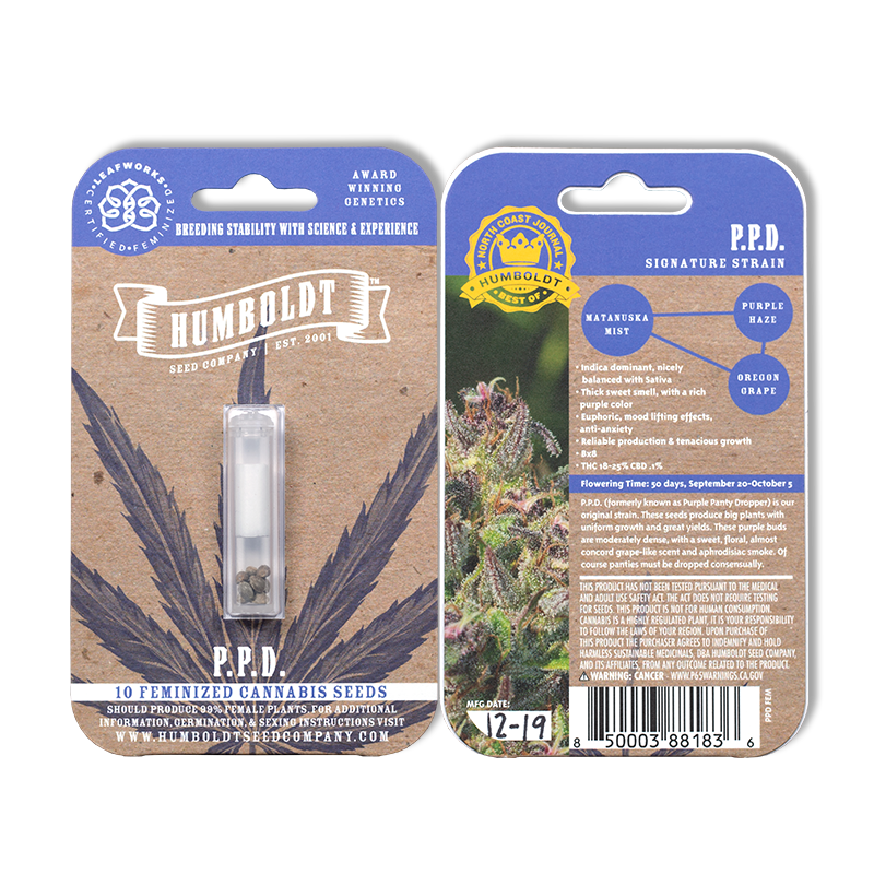 P.P.D (formerly known as Purple Panty Dropper) is Humboldt Seed Company’s original strain. These seeds produce big plants with uniform growth and great yields. These purple buds are moderately dense, with a sweet, floral, almost concord grape-like scent