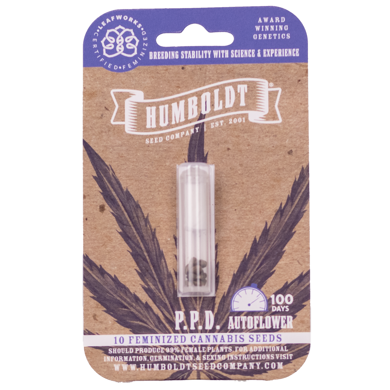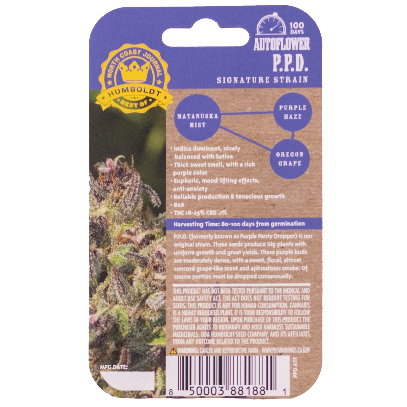 P.P.D Auto (formerly known as Purple Panty Dropper) is Humboldt Seed Company’s original strain. These seeds produce big plants with uniform growth and great yields. These purple buds are moderately dense, with a sweet, floral, almost concord grape-like scent and aphrodisiac smoke. Of course, panties must be dropped consensually.