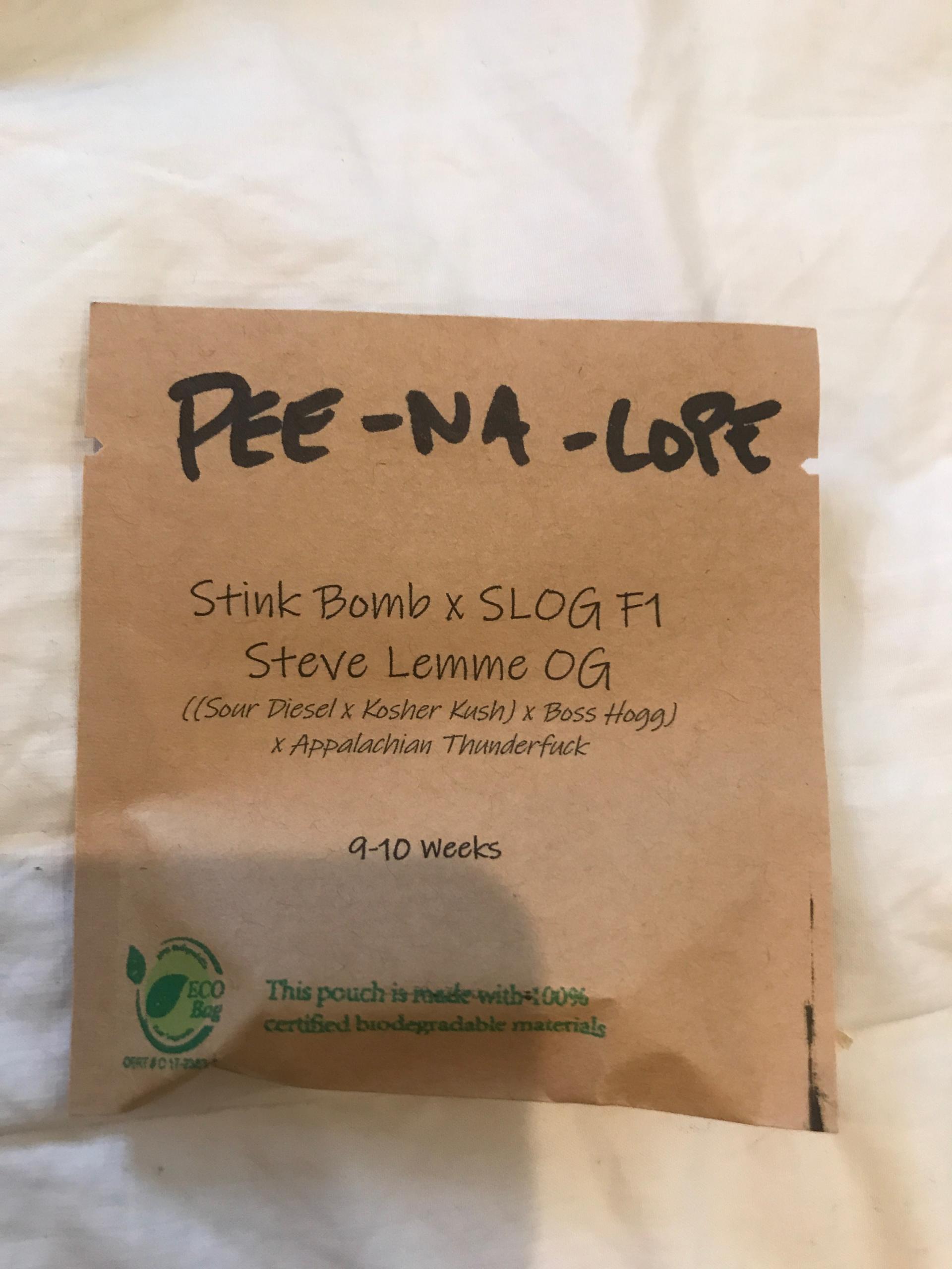 Pee-Na-Lope is an F1 cross bred by our friend Gaummaineian Gardens that is a cross of Archive Seeds’ Stink Bomb and Steve Lemme OG. Steve Lemme OG is ((Sour Diesel x Kosher Kush) x Boss Hogg) x Appalachian Thunderfuck. While Stink Bomb is an Indica-dominant hybrid from Archive Seed Bank. Stink Bomb combines the aroma and stout stature of NorCal Cat Piss with strong notes of lime from Face Off OG. Expect a flowering time of 9-10 Weeks.
