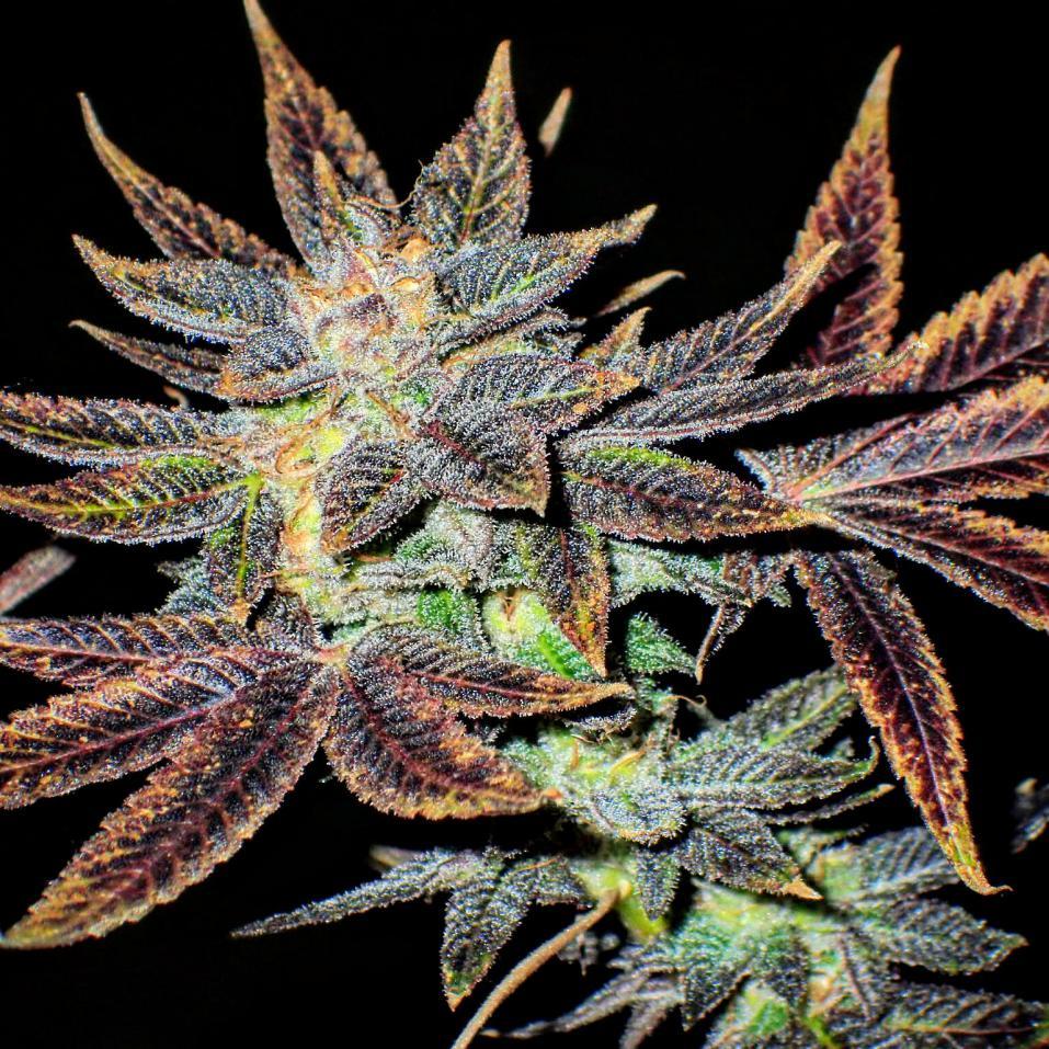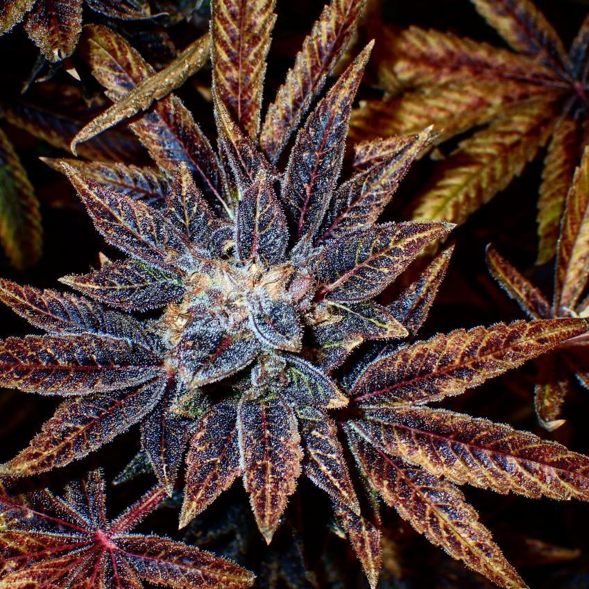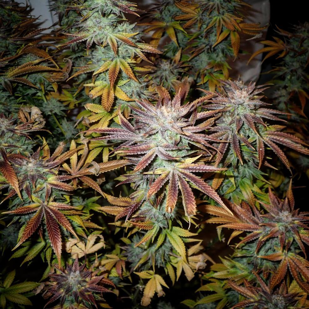 PTK x GB presents as a mostly Indica hybrid with extreme vigor that leads to tremendous branching and structure. She produces 8 and 9 week phenos that can be ran to 10 if preferred with the extreme coloring coming between 9 and 10 weeks. The Pine Tar Gush generally has a sharp pine tree like top end with skunky/hashy bottom notes mingled with a tart tangy sour apple essence that lingers on your lips. 8 and 9 weeks produced the sharpest pine smells, later the skunky bottom end becomes stronger and she develops a complex full bodied smoke thick with pine, apple and skunk notes. These flowers have an incredibly powerful smell that will get you both looks of approval and looks of disdain!