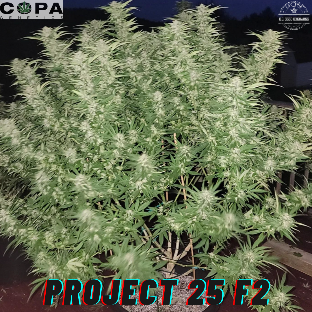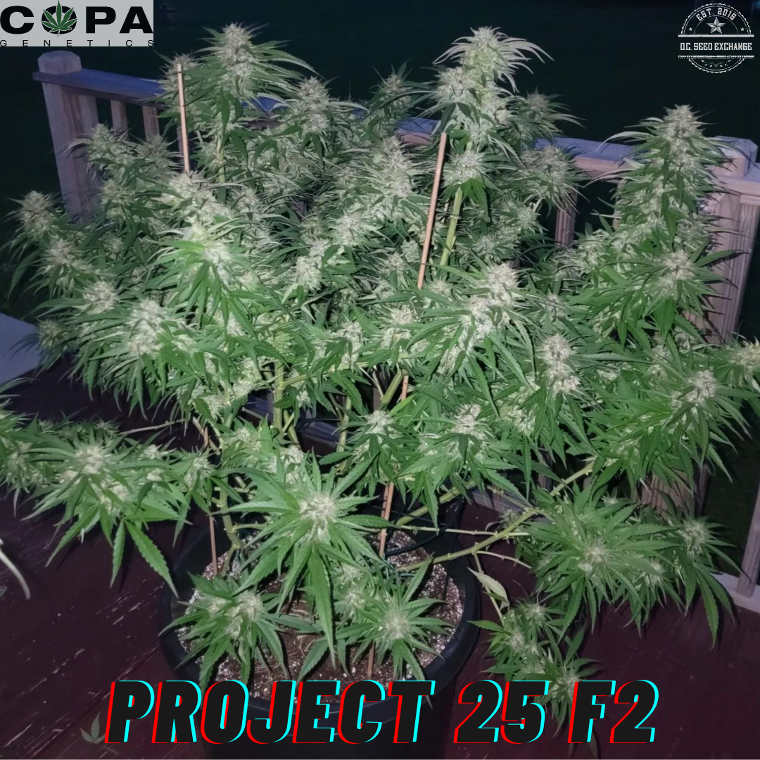 Copa Genetics’ Project 25 (Iranian OG x Fast Pink) is an F2 cross of Project 25 (Copa Cut) x Project 25 F1 (R). Super unique terpene profile with some phenos displaying variegated leaves.