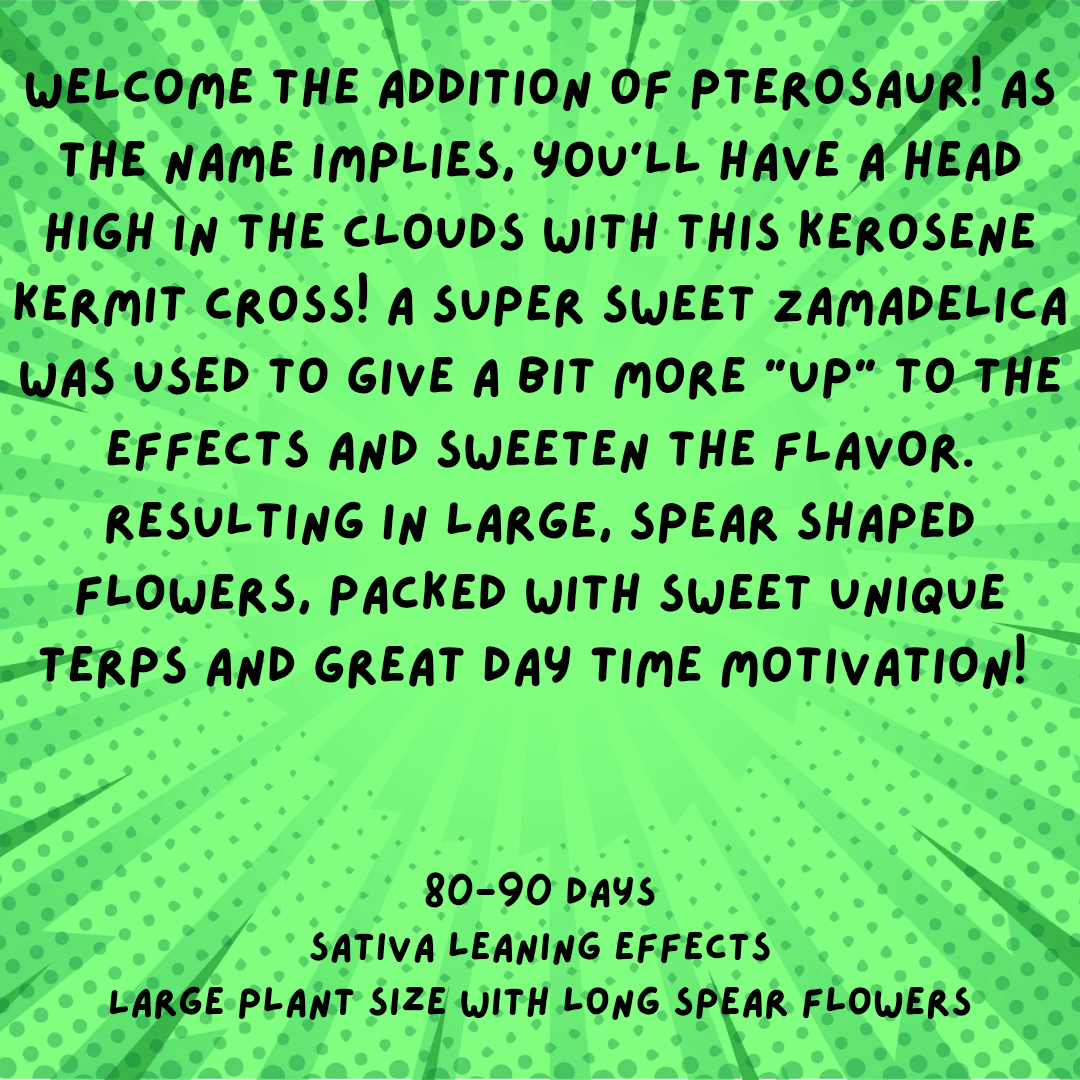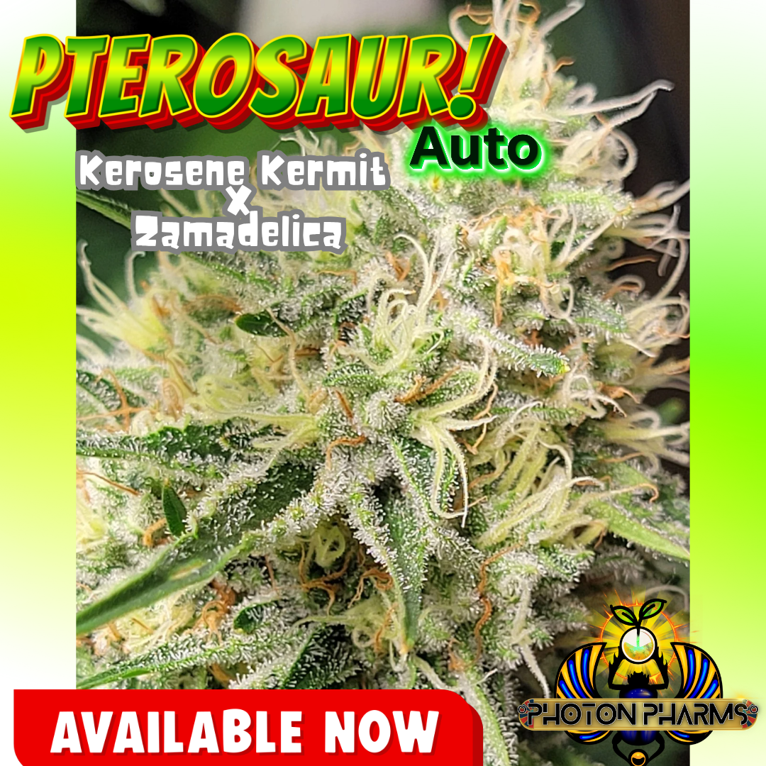 Photon Pharms Pterosaur (Kerosene Krush x Zamadelica) – Prepare to soar high with Pterosaur! This cross combines the unique profile of Kerosene Krush with a super sweet Zamadelica to enhance the uplifting effects and sweeten the flavor.