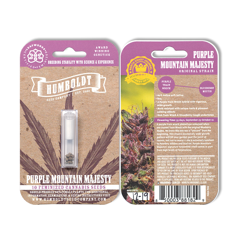 A purple Trainwreck phenotype unlocked when we crossed Trainwreck with the original Blueberry Muffin. We knew it was a “unicorn” from the beginning. An excessively wide growth pattern will fill your garden past the point of reason, but not to worry – she is extremely resistant to powdery mildew and bud rot. The signature turpentine smell comes in part from the high levels of terpinolene.