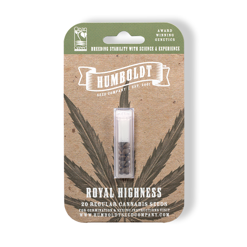 A recently refined version of one of our original creations, Royal Highness is a cross of epic potency and production that is sure to know your crown off. This plant produces buds the size of baseball bats, absolutely dripping with resin. The distinct Kush smell of Royal Highness is due to her higher levels of Humulene and Pinene. One of our most trichome covered varieties.