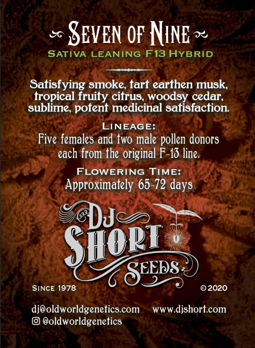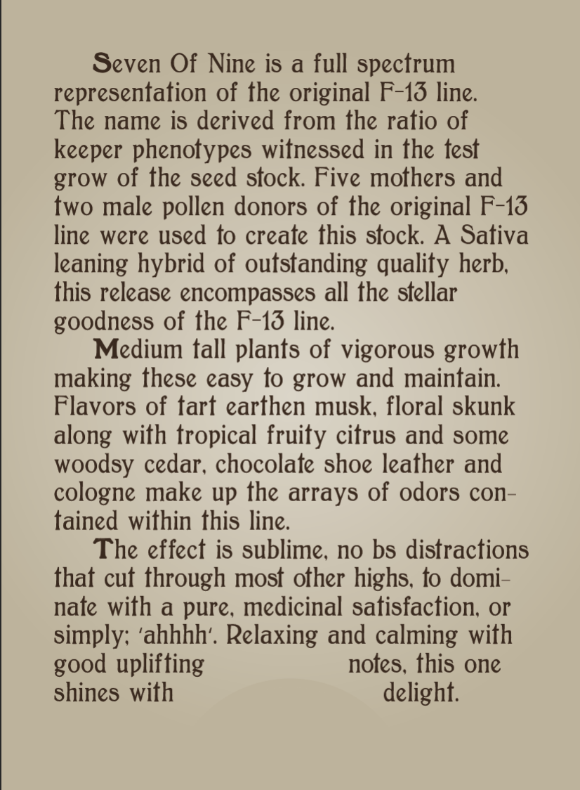 The name is derived from the ratio of keeper phenotypes witnessed in the test grow of the Seven of Nine seed stock. 5 female mothers and 2 male pollen donors of the original F-13 line were used to create this stock. A Sativa leaning hybrid of outstanding quality herb, this release encompasses all the stellar goodness of the F-13 line. Medium tall plants of vigorous growth making these easy to grow and maintain. Flavors of tart earthen musk, floral skunk along with tropical fruity citrus and some woodsy cedar, chocolate shoe leather, and cologne make up the arrays of odors contained within this line. The effect is sublime, no bs distractions that cuts through most other highs to dominate with pure, medicinal satisfaction, or simply; ‘ahhhh‘. Relaxing and calming with good uplifting notes, this one shines with delight.