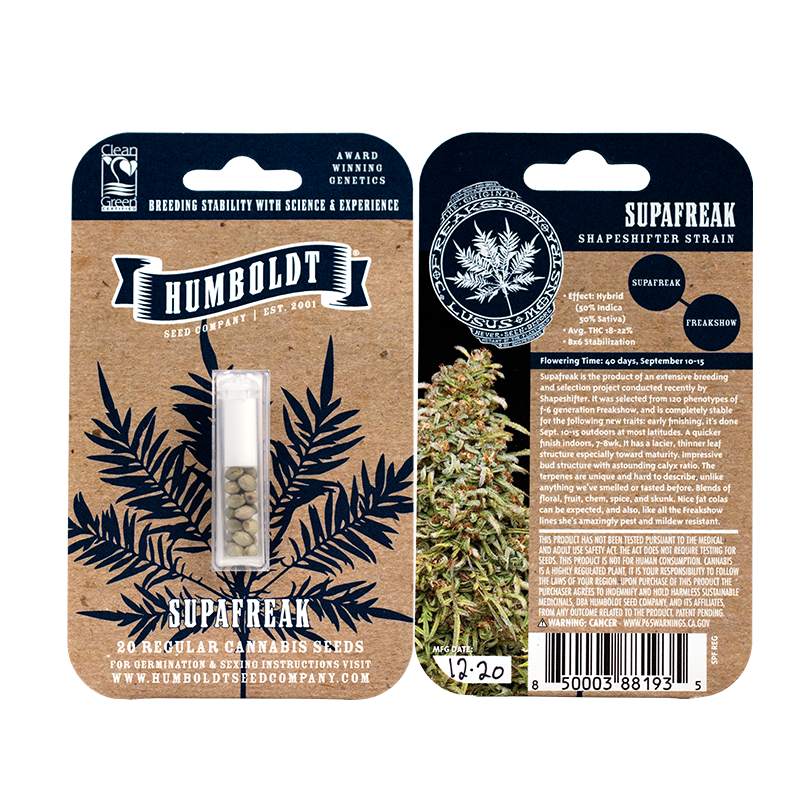 Supafreak is the product of an extensive breeding and selection product conducted recently by Shapeshifter. It was selected from 120 phenotypes of F6 generation Freakshow, and is completely stable for the following new traits: early finishing, it’s done Sept. 10-15 outdoors at most latitudes. A quicker finish indoors, 7-8wk. It has a lacier, thinner leaf structure, especially toward maturity. Impressive bud structure with astounding calyx ratio. The terpenes are unique and hard to describe, unlike anything we’ve smelled or tasted before. Blends of floral, fruit, chem, spice, and skunk. Nice fat colas can be expected, and also, like all the Freakshow lines she’s amazingly pest and mildew resistant.