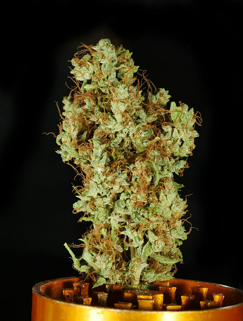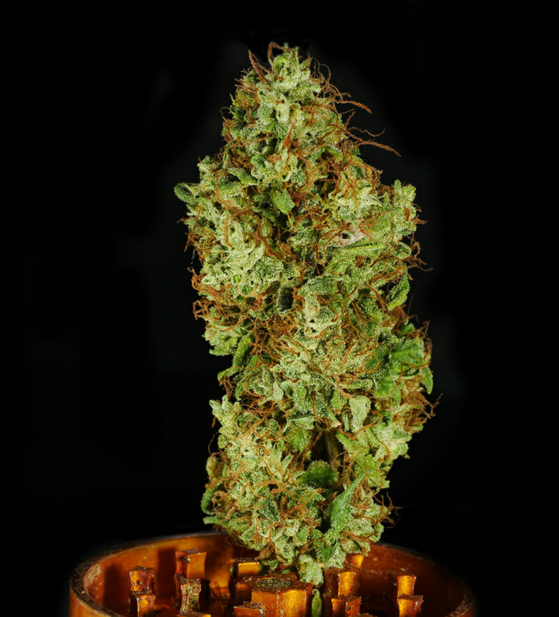 Mom 4: Sour body odor and pumpkin aroma, on an indica frame. Super frosty and dense.